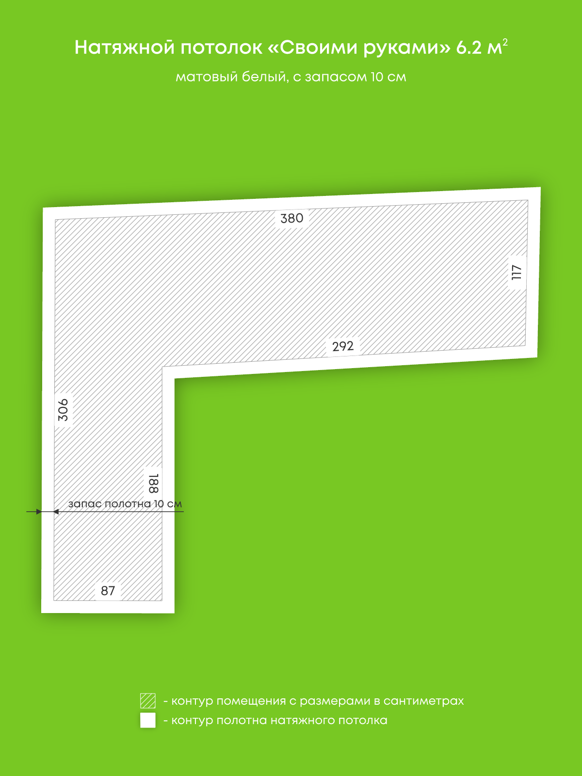 Натяжной потолок белый матовый, изготовленный по индивидуальным размерам покупателя, для помещения площадью 6.2 м2