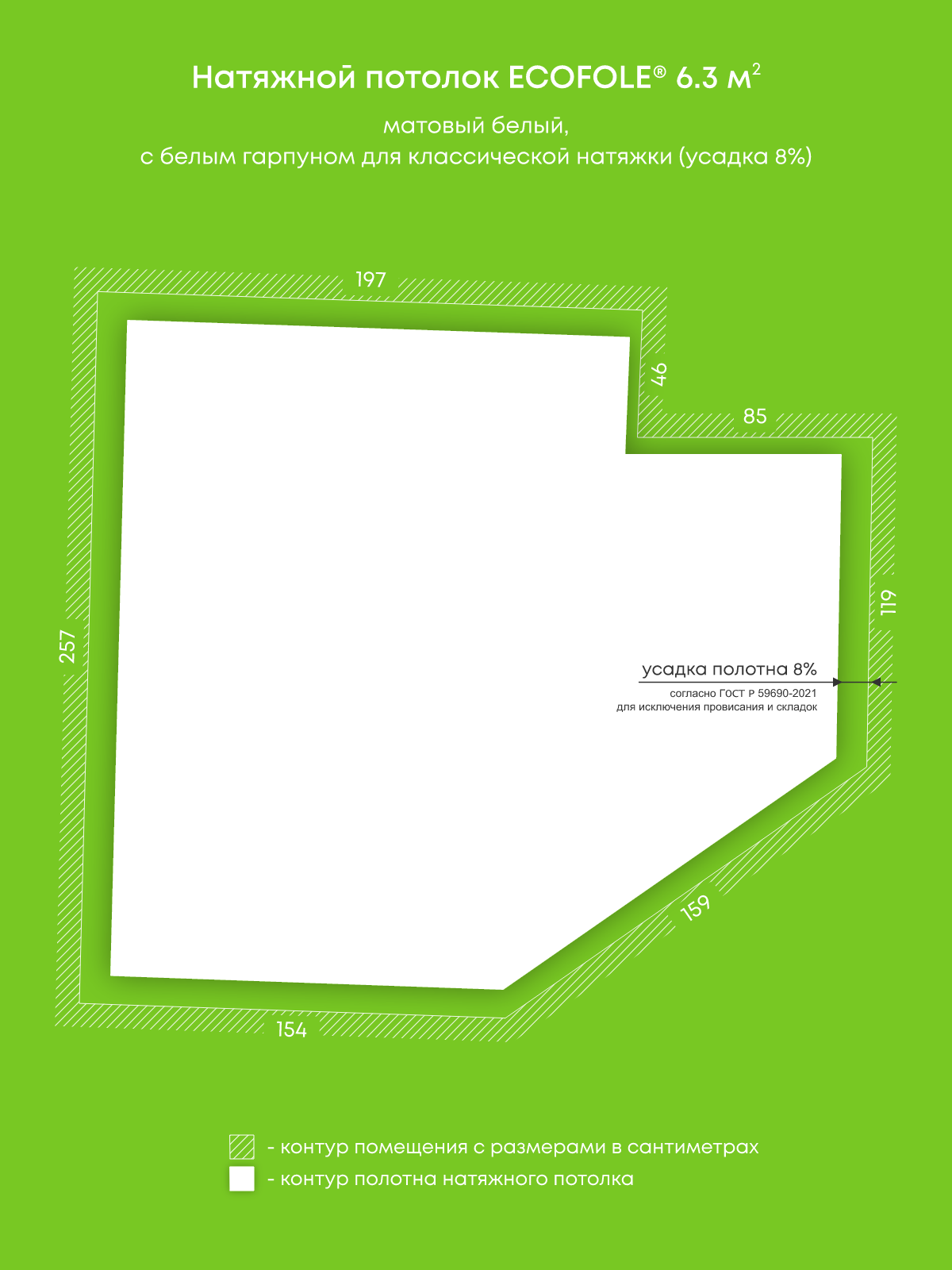 Натяжной потолок белый матовый, изготовленный по индивидуальным размерам покупателя, для помещения площадью 6.3 м2
