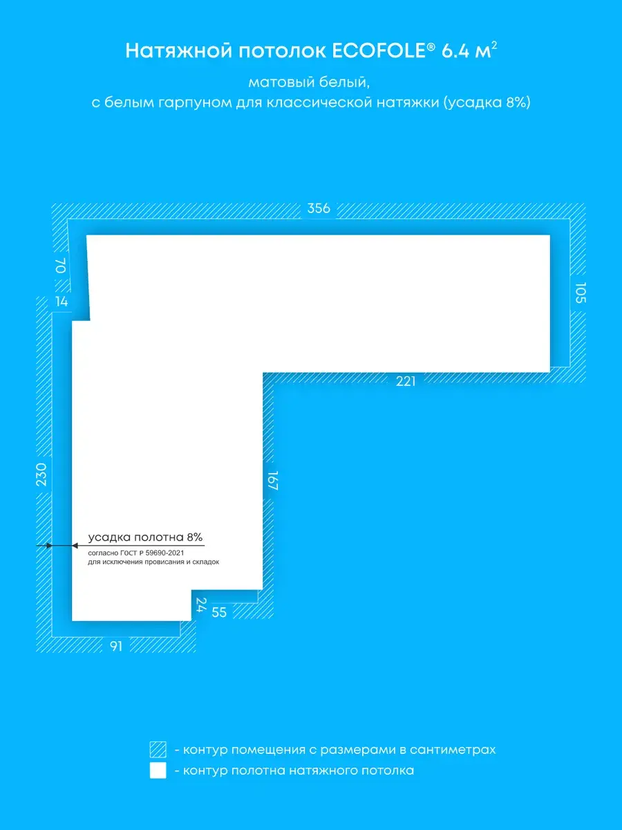 - Технология производства натяжного потолка предусматривает его усадку на 4-9% для исключения провисания после монтажа, т.е. фактический размер готового потолка составляет на 4-9% меньше исходного размера помещения и не является браком;