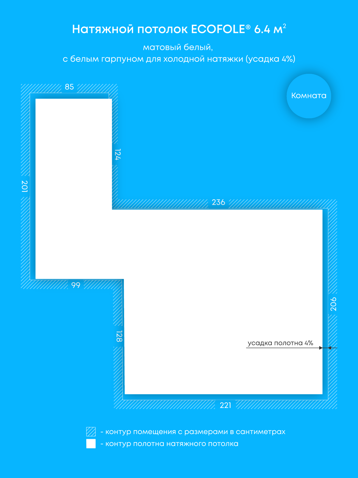 Натяжной потолок белый матовый, холодной натяжки, изготовленный по индивидуальным размерам покупателя, для помещения площадью 6.4 м2