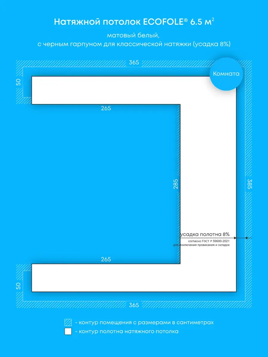 - Технология производства натяжного потолка предусматривает его усадку на 4-9% для исключения провисания после монтажа, т.е. фактический размер готового потолка составляет на 4-9% меньше исходного размера помещения и не является браком;