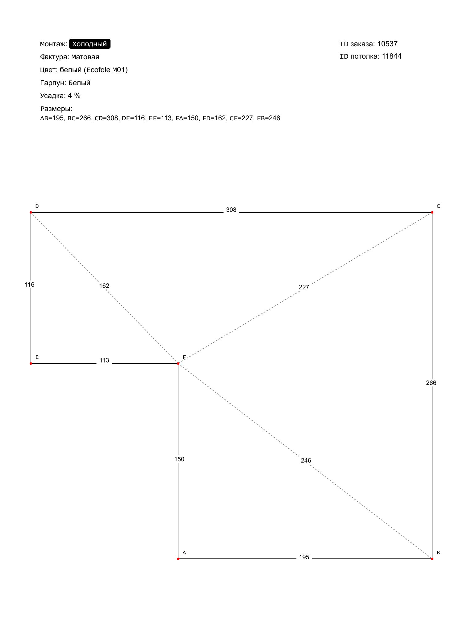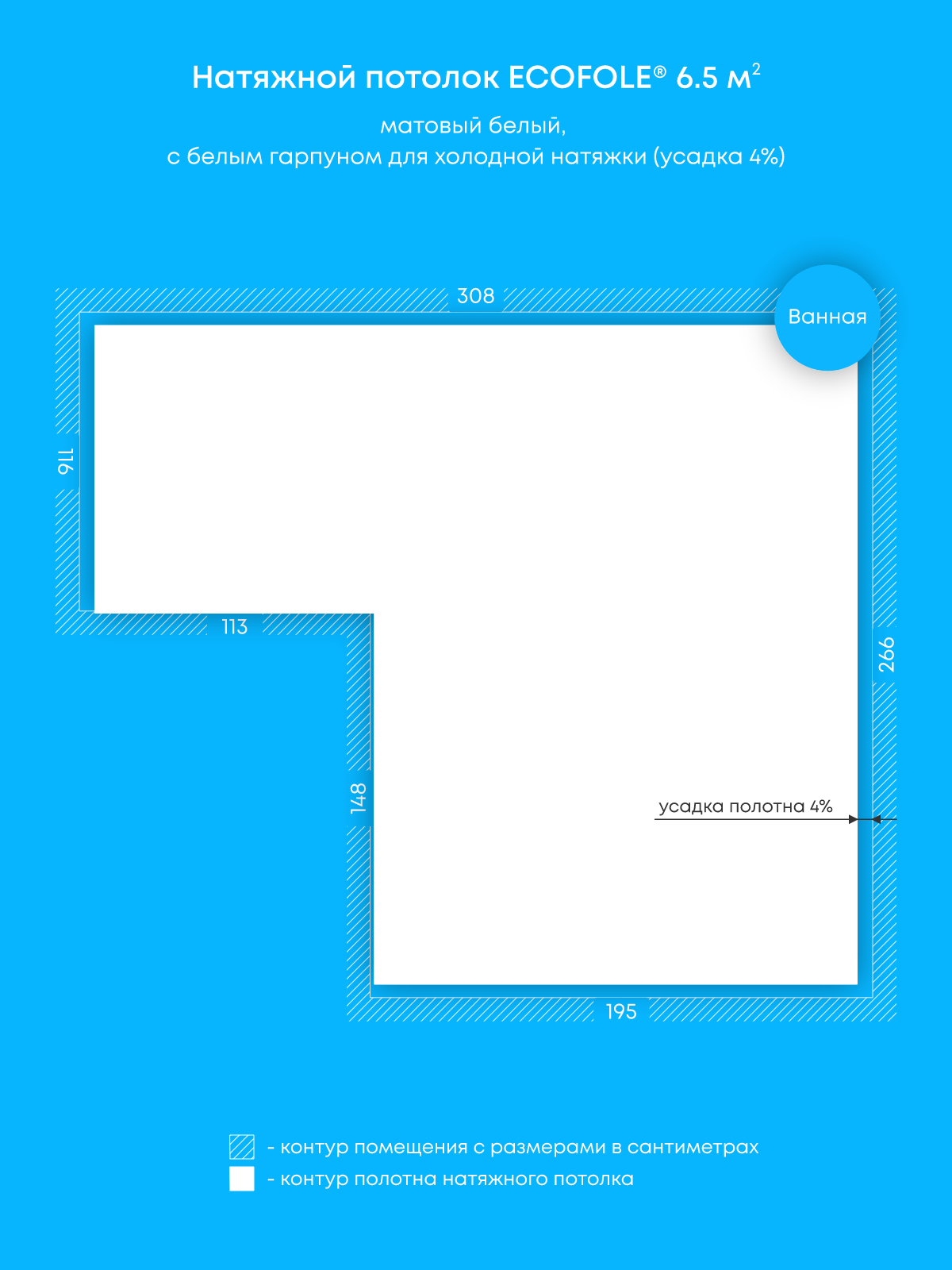 Натяжной потолок белый матовый, холодной натяжки, изготовленный по индивидуальным размерам покупателя, для помещения площадью 6.5 м2