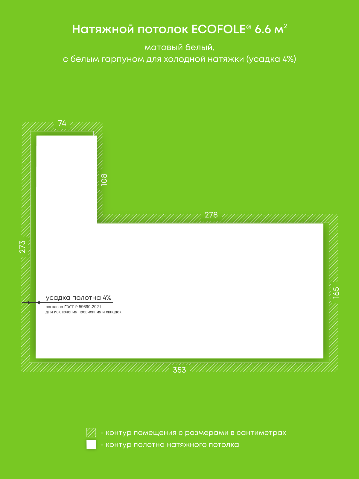 Натяжной потолок белый матовый, изготовленный по индивидуальным размерам покупателя, для помещения площадью 6.6 м2