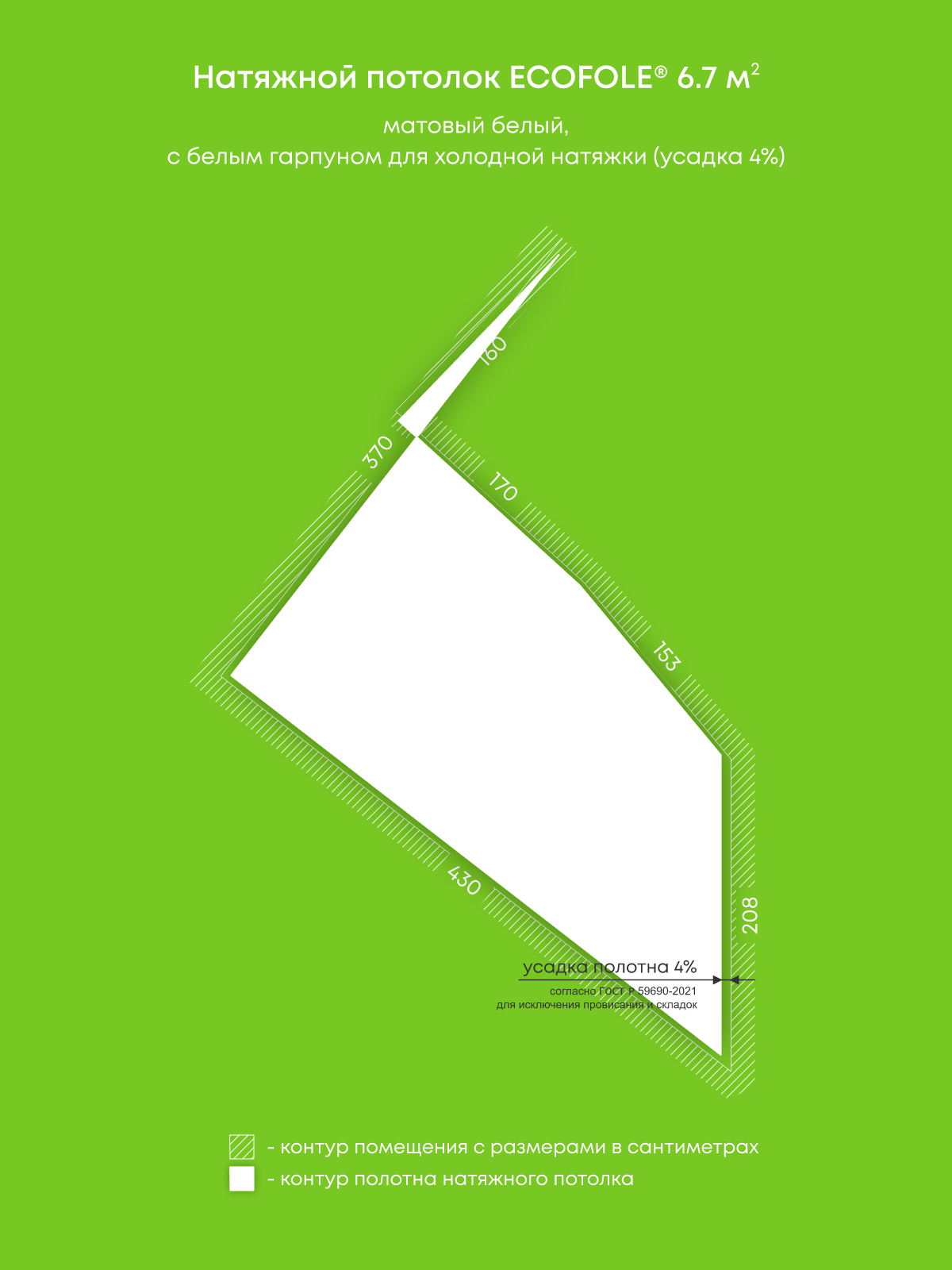 Натяжной потолок белый матовый, изготовленный по индивидуальным размерам покупателя, для спальни площадью 6.7 м2