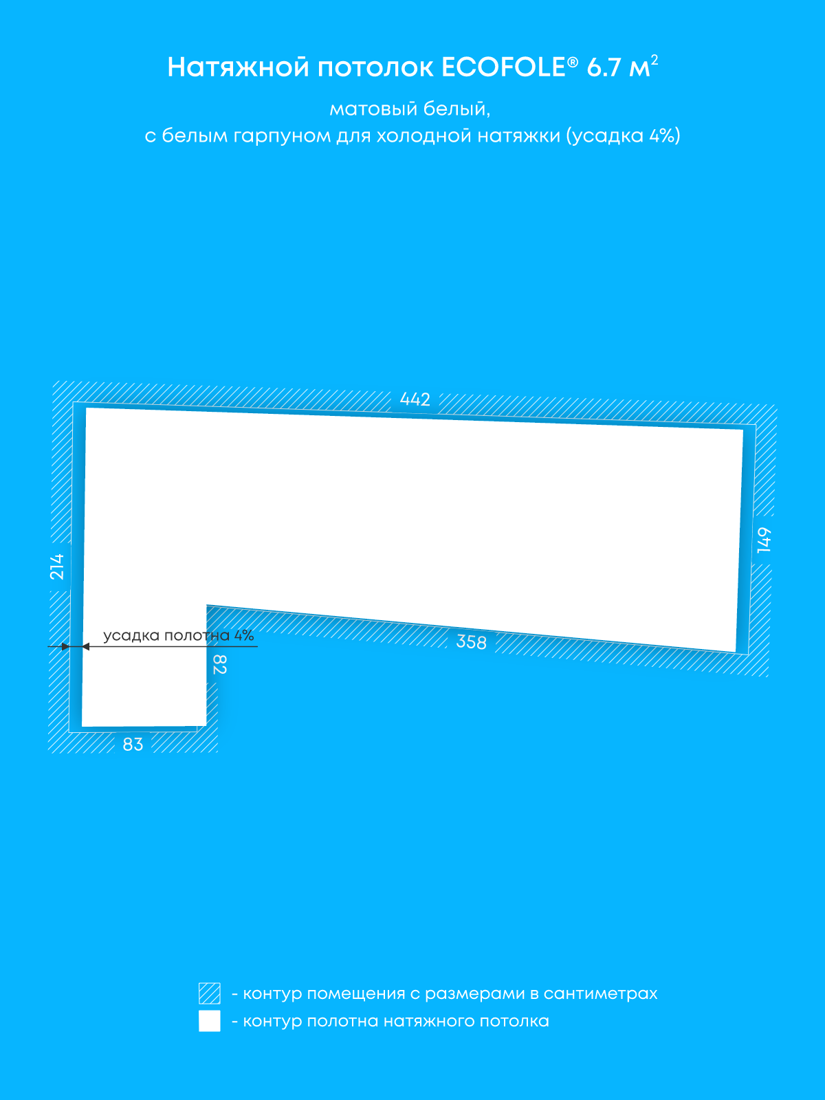 Натяжной потолок белый матовый, изготовленный по индивидуальным размерам покупателя, для помещения площадью 6.7 м2