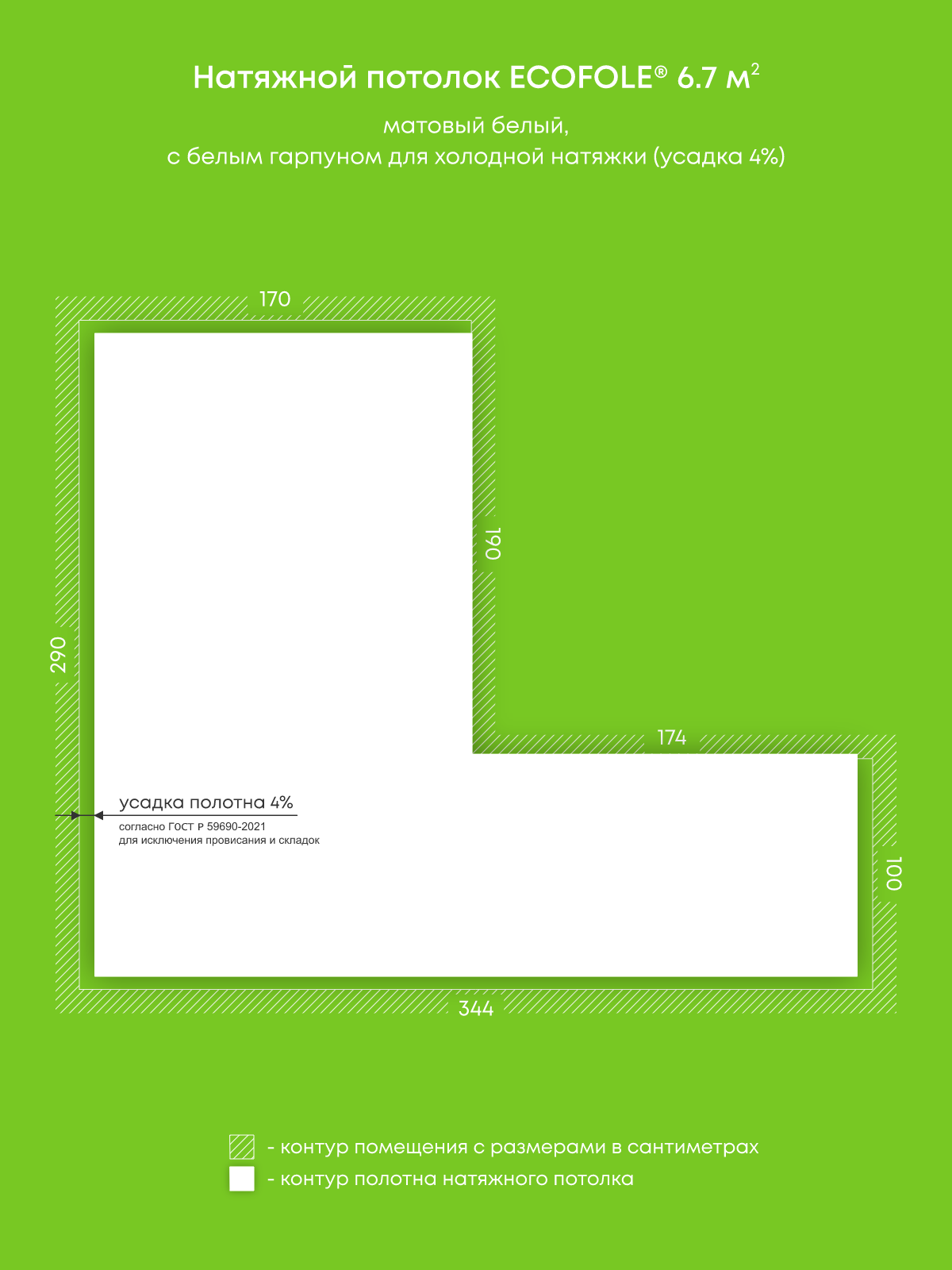 Натяжной потолок белый матовый, изготовленный по индивидуальным размерам покупателя, для помещения площадью 6.7 м2