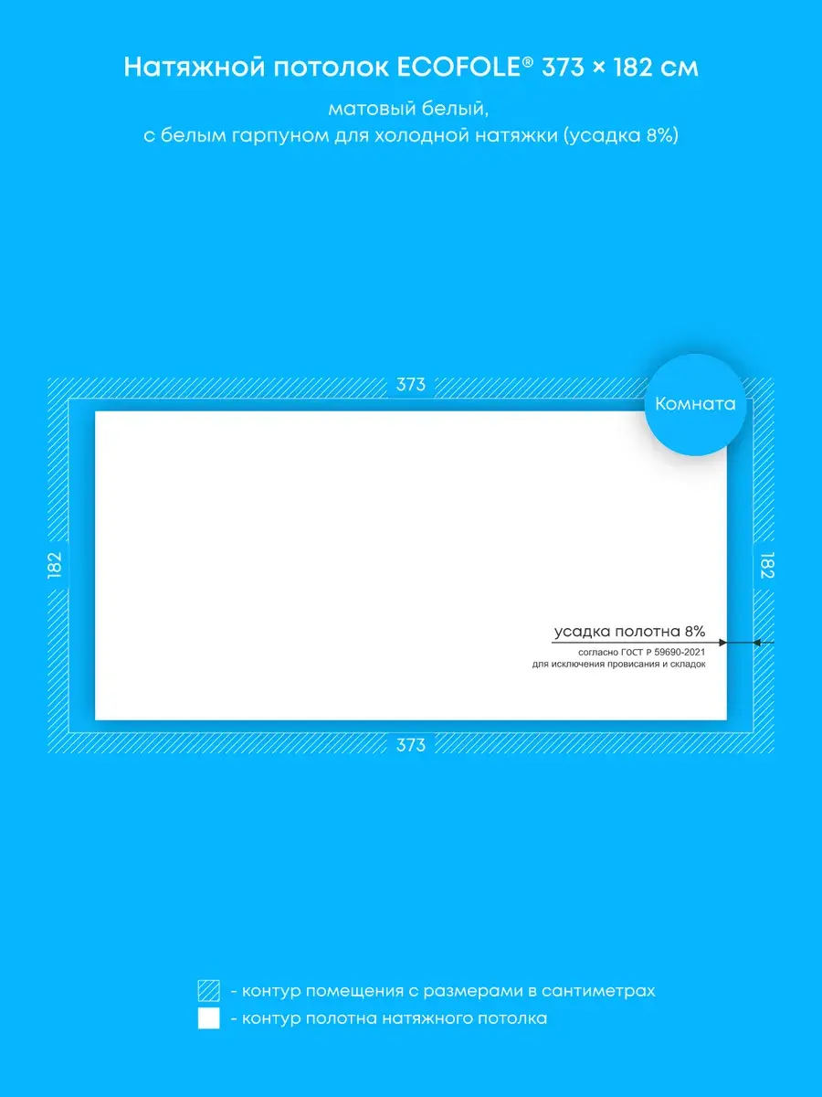 - Технология производства натяжного потолка предусматривает его усадку на 4-9% для исключения провисания после монтажа, т.е. фактический размер готового потолка составляет на 4-9% меньше исходного размера помещения и не является браком;