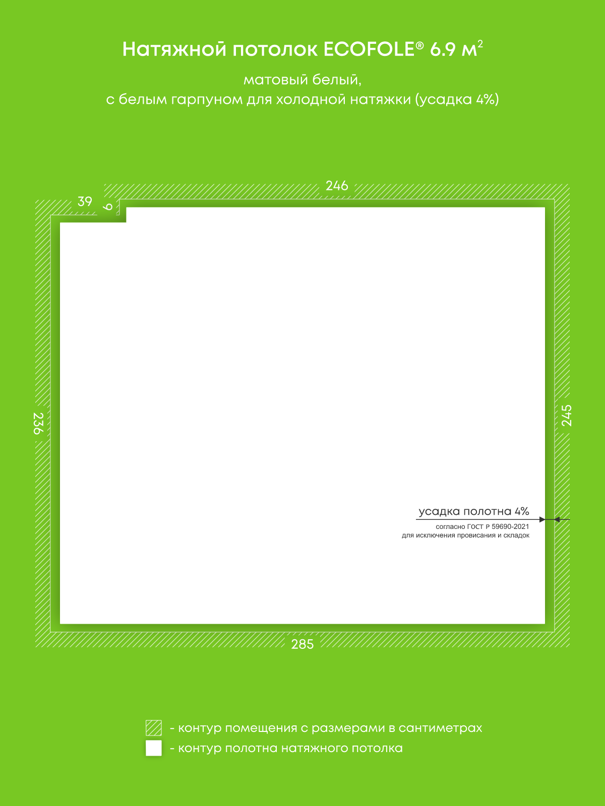 Натяжной потолок белый матовый, изготовленный по индивидуальным размерам покупателя, для спальни площадью 6.9 м2
