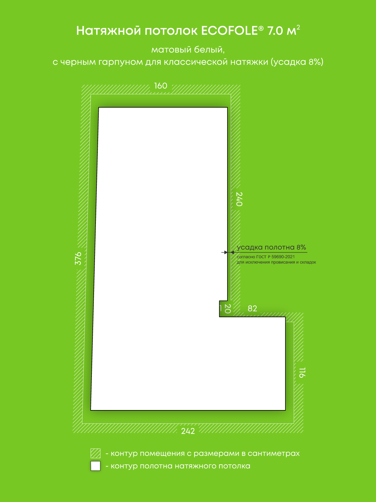 Натяжной потолок белый матовый, изготовленный по индивидуальным размерам покупателя, для кухни площадью 7 м2