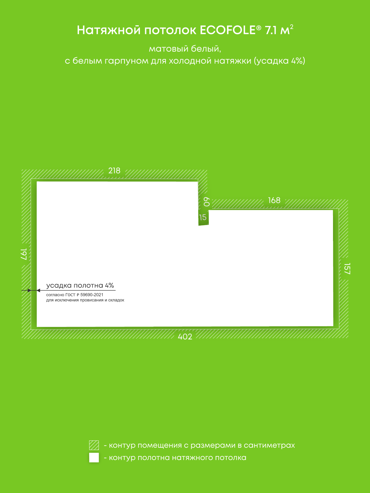 Натяжной потолок белый матовый, изготовленный по индивидуальным размерам покупателя, для помещения площадью 7.1 м2