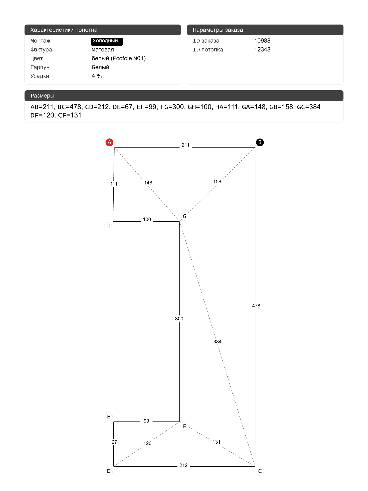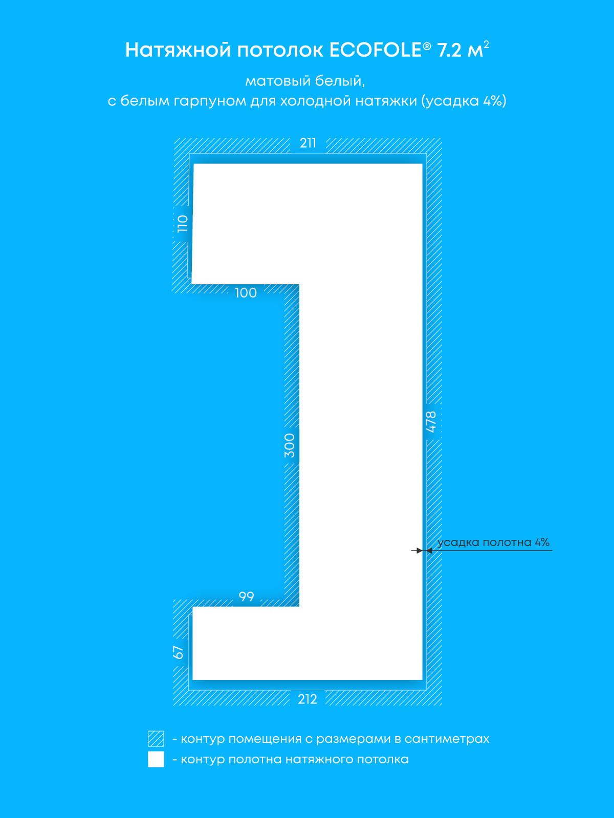 Натяжной потолок белый матовый, холодной натяжки, изготовленный по индивидуальным размерам покупателя, для помещения площадью 7.2 м2