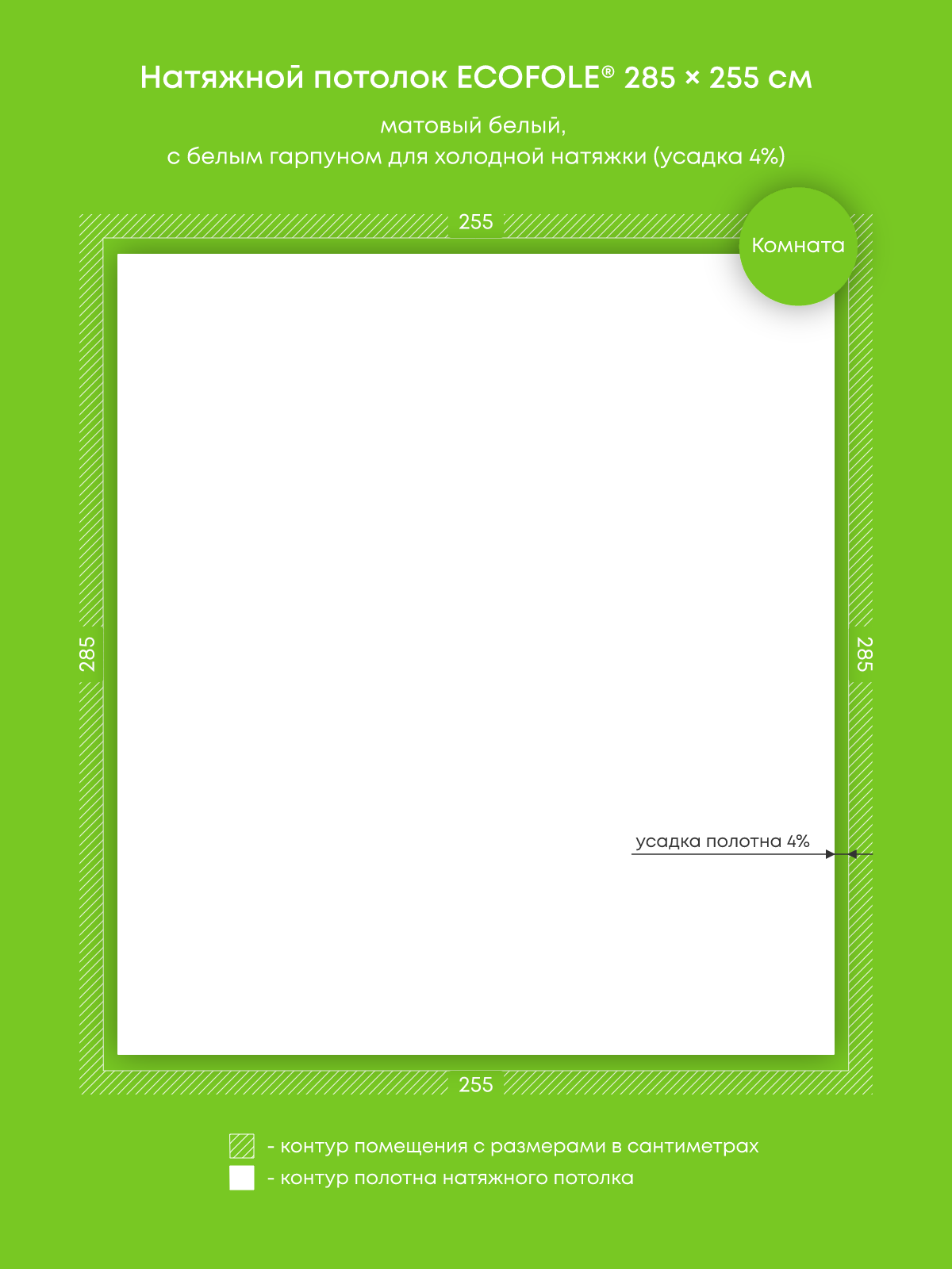 Натяжной потолок белый матовый, холодной натяжки, изготовленный по индивидуальным размерам покупателя, для помещения площадью 7.3 м2
