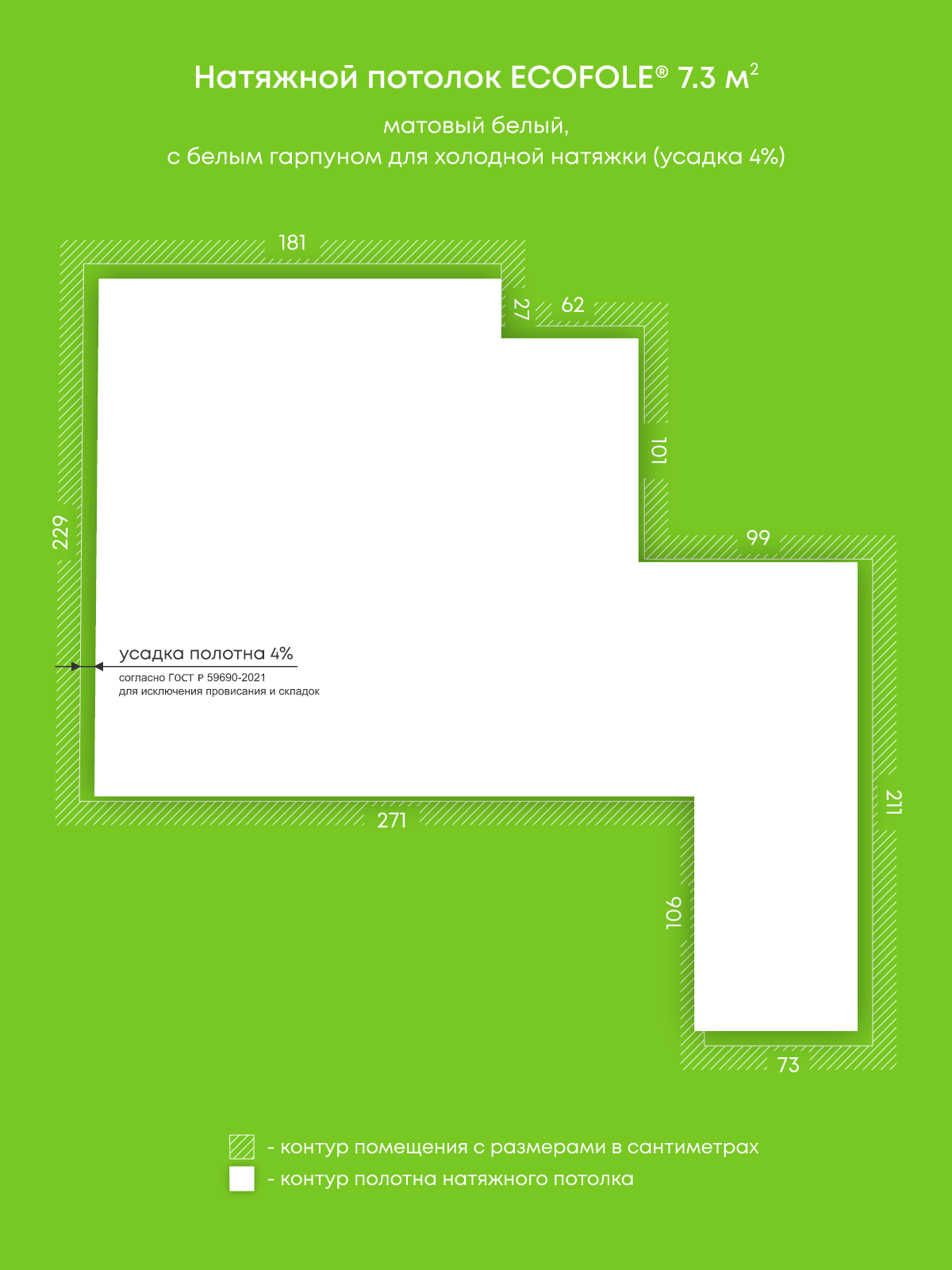 Натяжной потолок белый матовый, изготовленный по индивидуальным размерам покупателя, для помещения площадью 7.3 м2