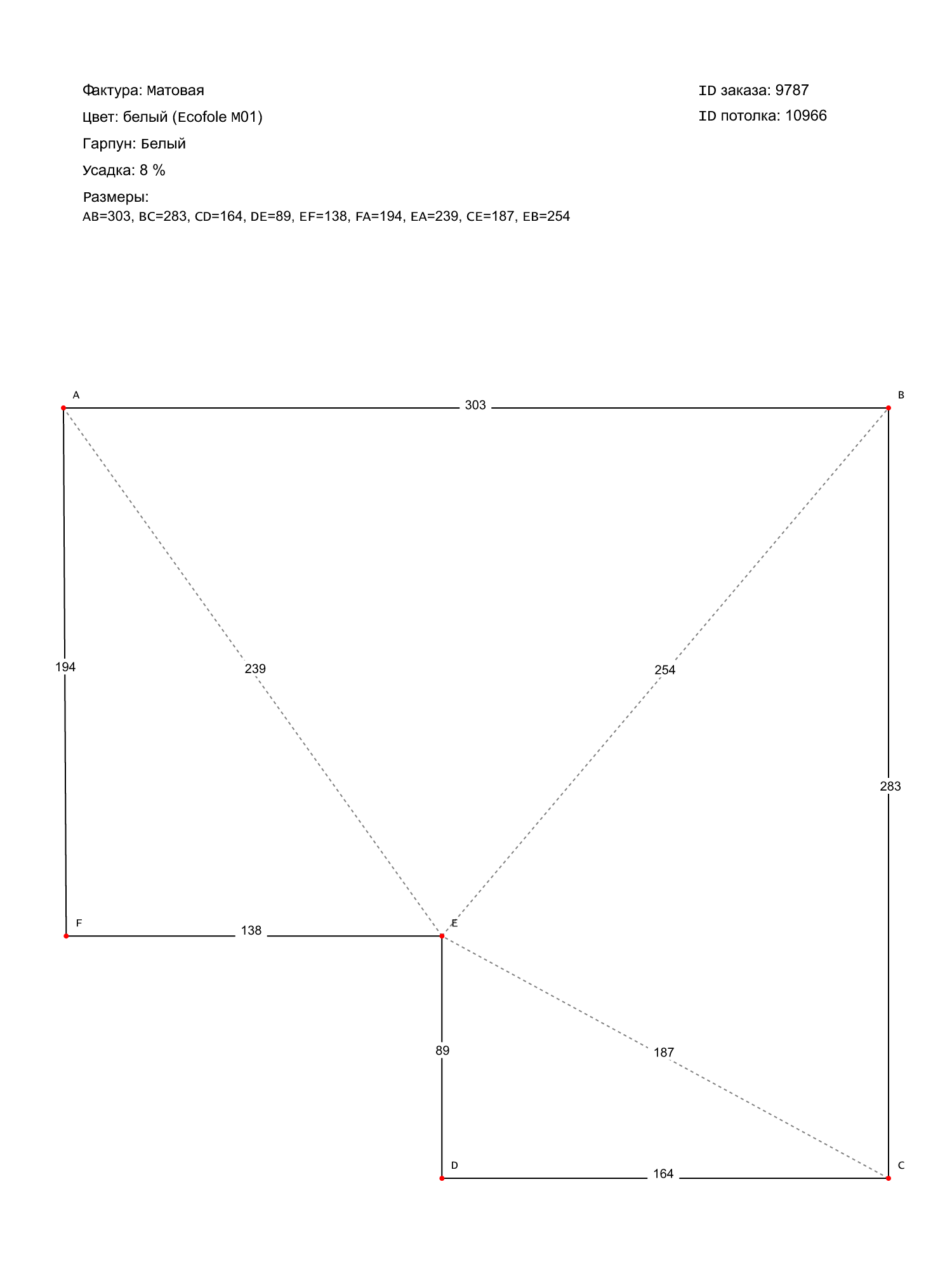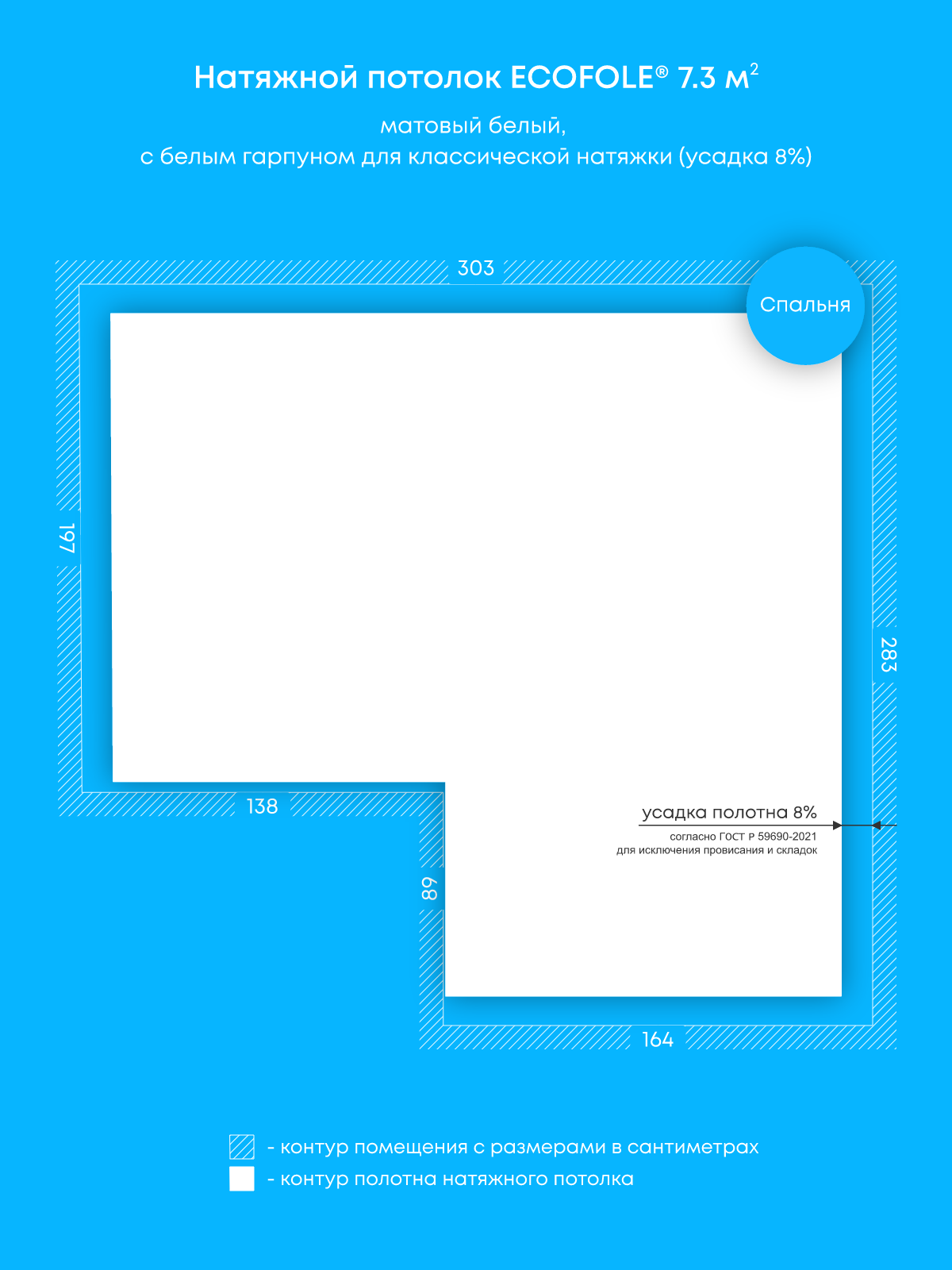 Натяжной потолок белый матовый, классической натяжки, изготовленный по индивидуальным размерам покупателя, для помещения площадью 7.3 м2