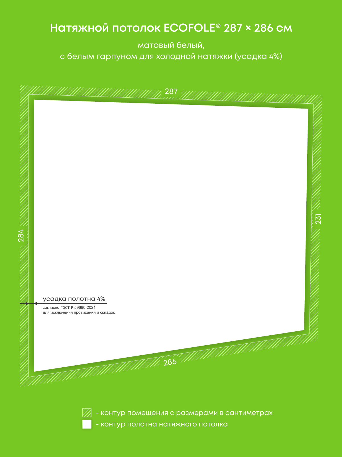 Натяжной потолок белый матовый, изготовленный по индивидуальным размерам покупателя, для помещения площадью 7.3 м2