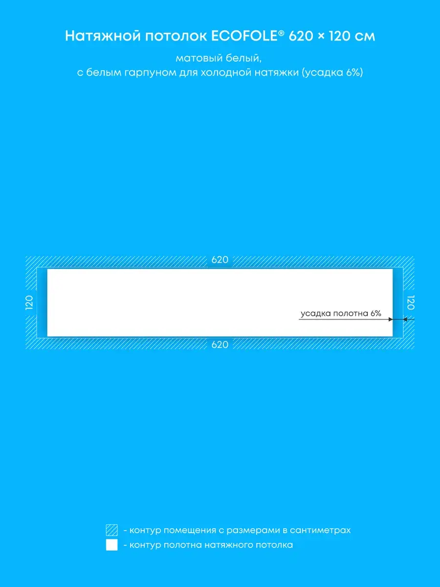 - Технология производства натяжного потолка предусматривает его усадку на 4-9% для исключения провисания после монтажа, т.е. фактический размер готового потолка составляет на 4-9% меньше исходного размера помещения и не является браком;