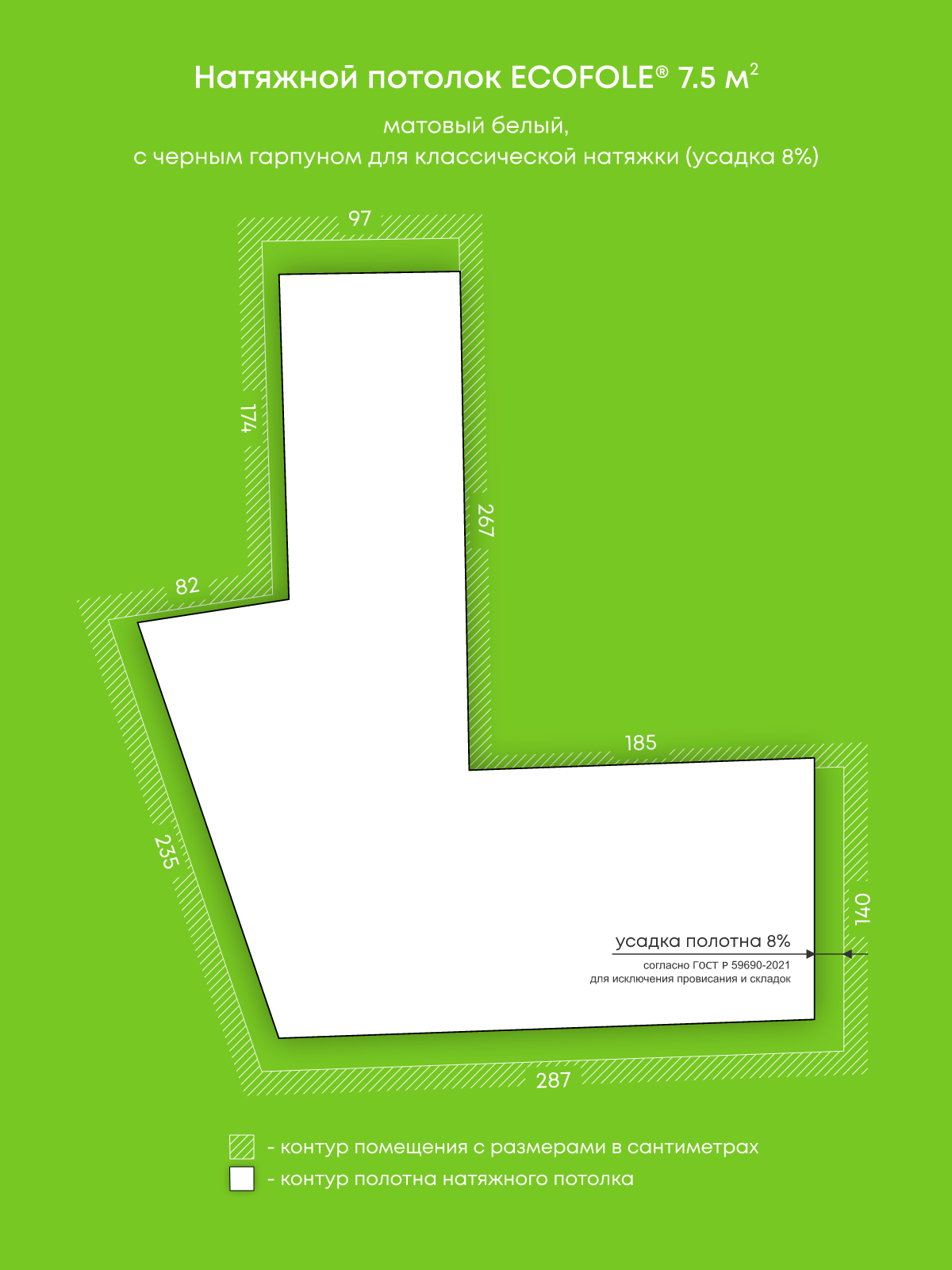 Натяжной потолок белый матовый, изготовленный по индивидуальным размерам покупателя, для помещения площадью 7.5 м2