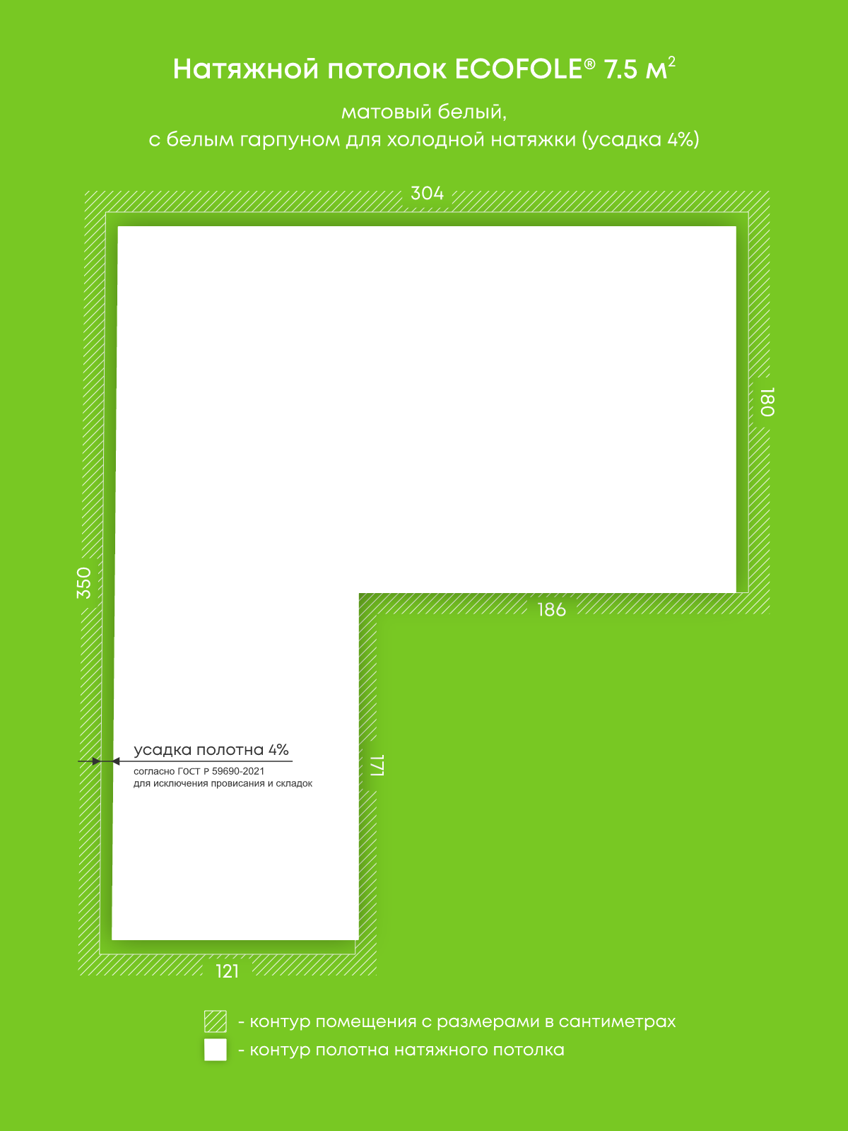 Натяжной потолок белый матовый, изготовленный по индивидуальным размерам покупателя, для гостиной площадью 7.5 м2