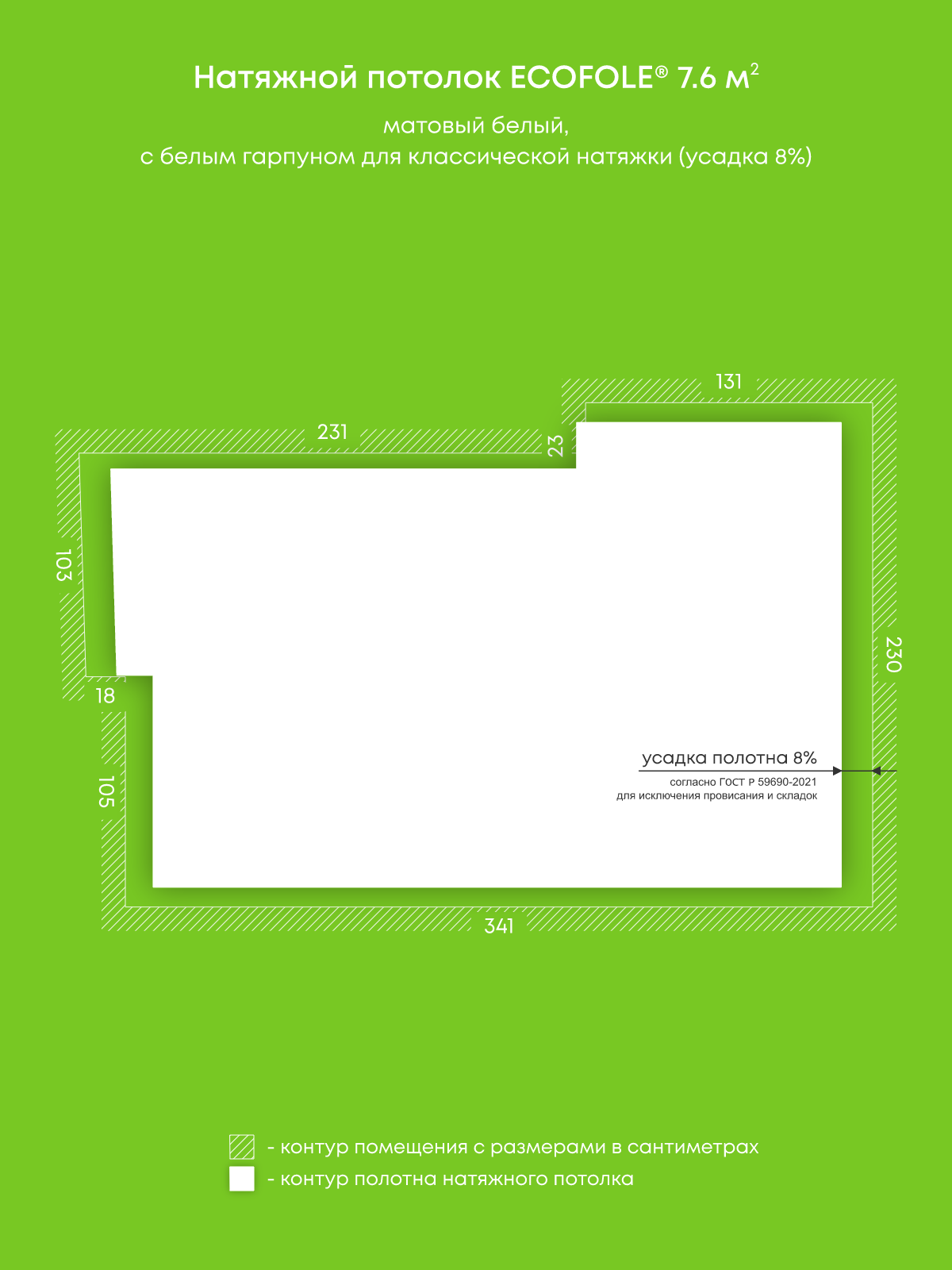 Натяжной потолок белый матовый, изготовленный по индивидуальным размерам покупателя, для гостиной площадью 7.6 м2