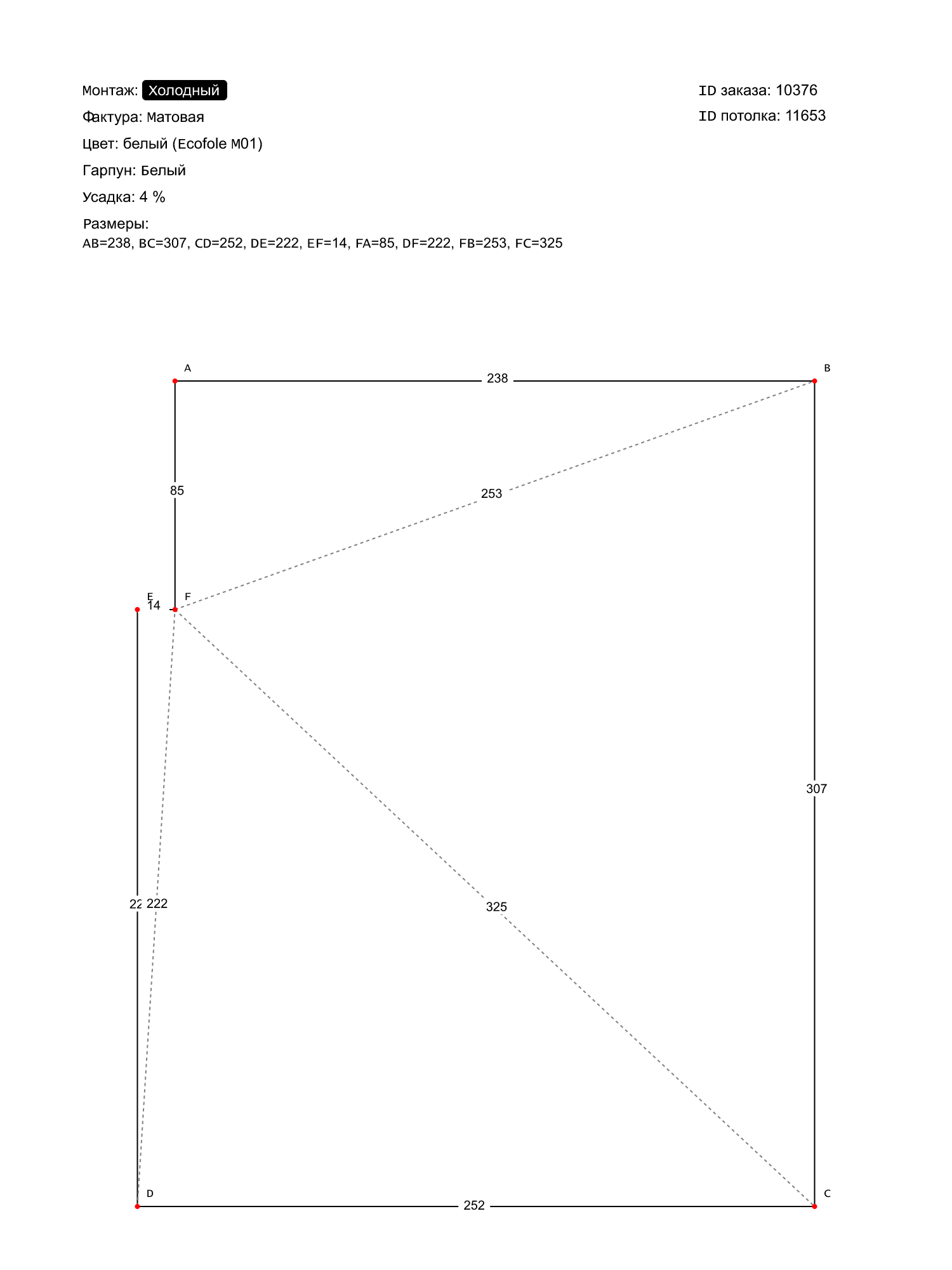 Натяжной потолок белый матовый, холодной натяжки, изготовленный по индивидуальным размерам покупателя, для помещения площадью 7.6 м2