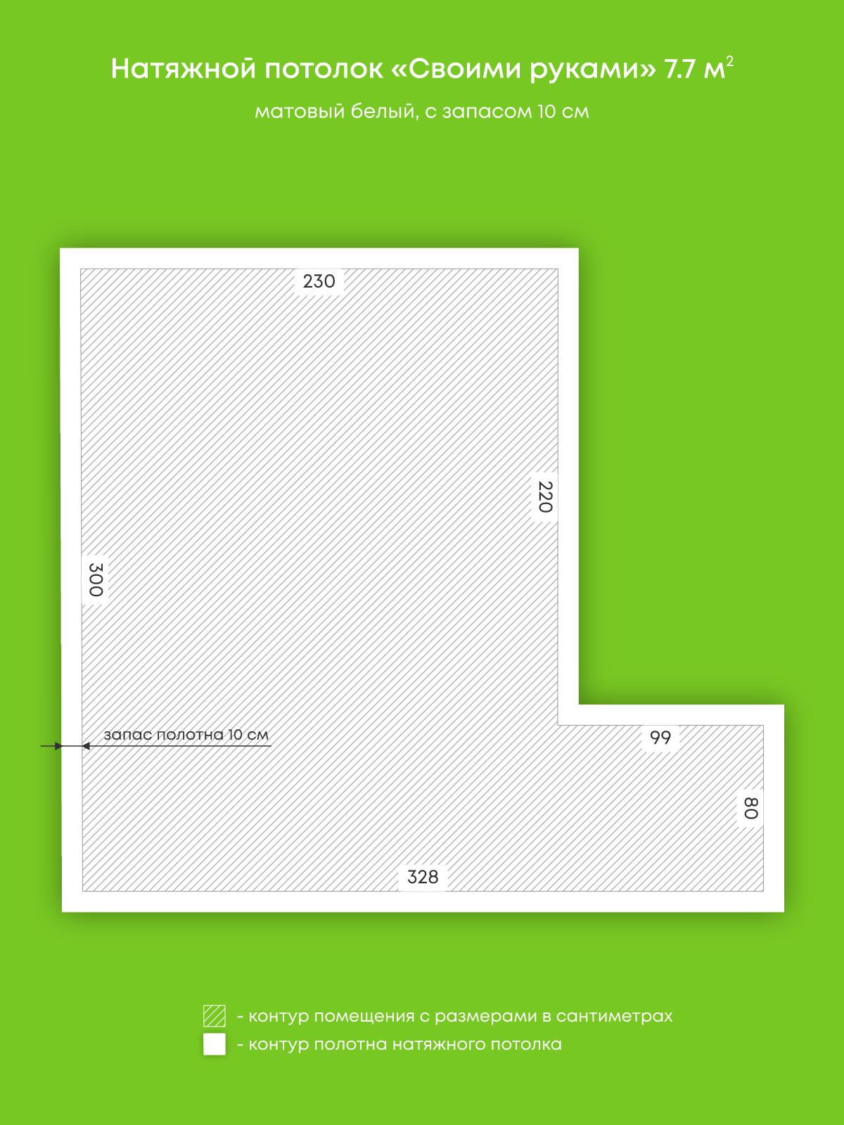 Натяжной потолок белый матовый, изготовленный по индивидуальным размерам покупателя, для кухни площадью 7.7 м2