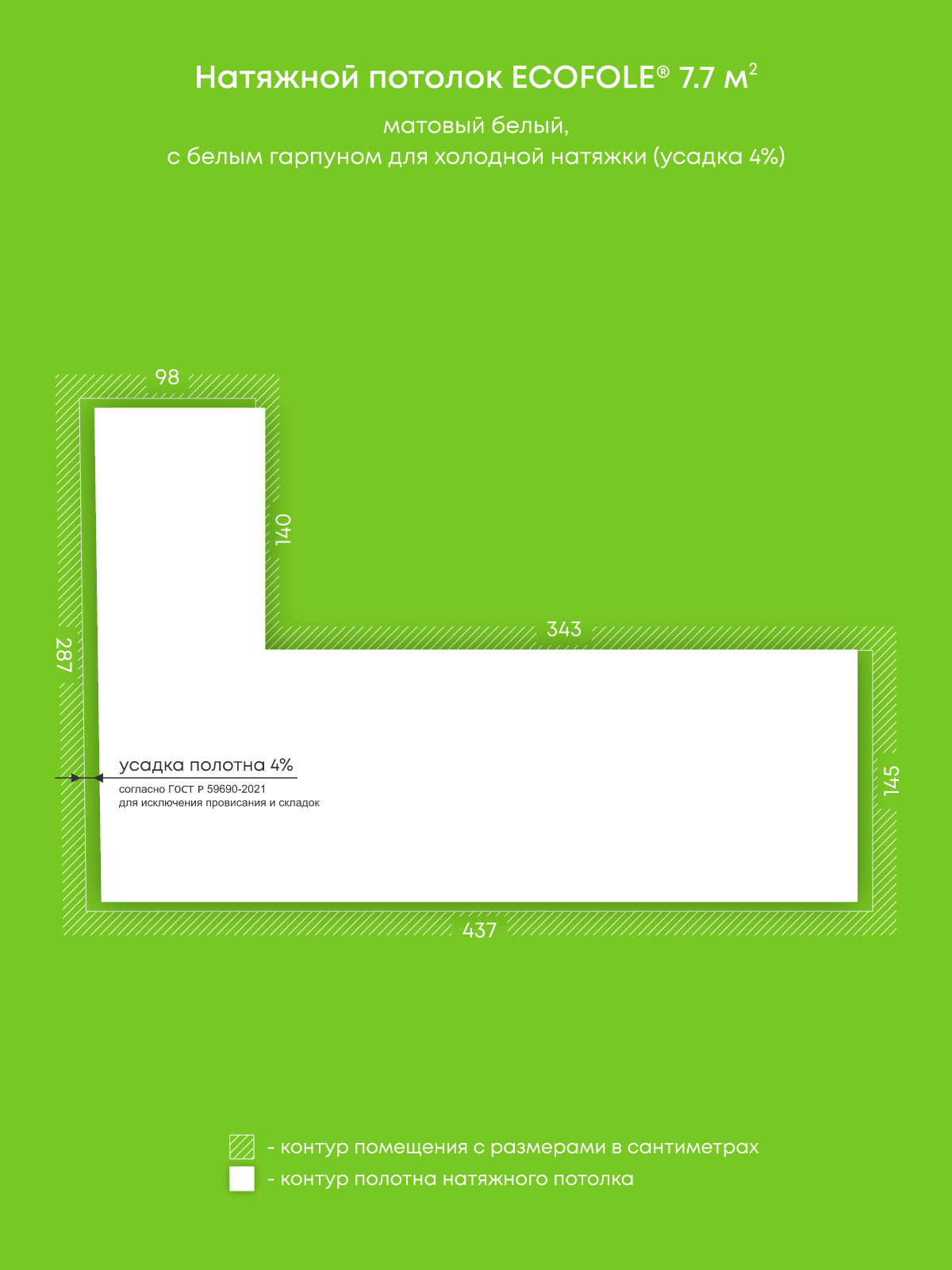 Натяжной потолок белый матовый, изготовленный по индивидуальным размерам покупателя, для помещения площадью 7.7 м2