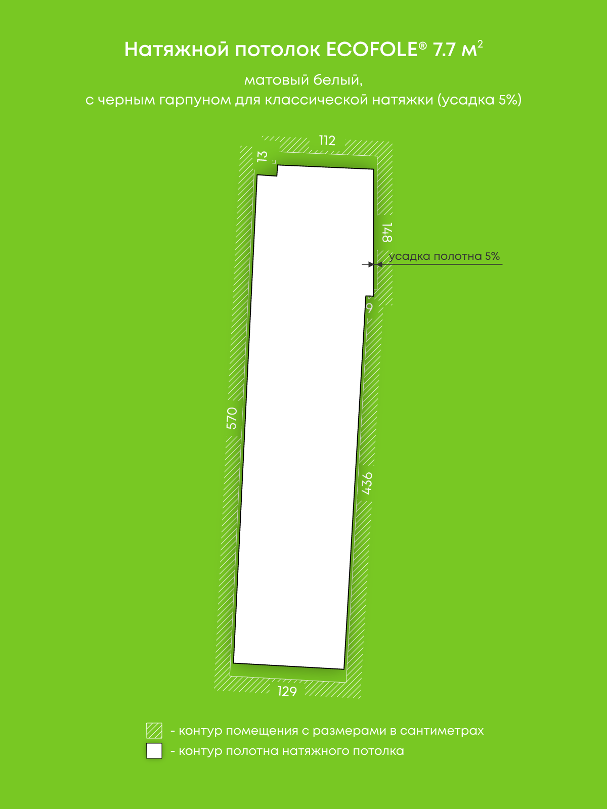 Натяжной потолок белый матовый, изготовленный по индивидуальным размерам покупателя, для помещения площадью 7.7 м2