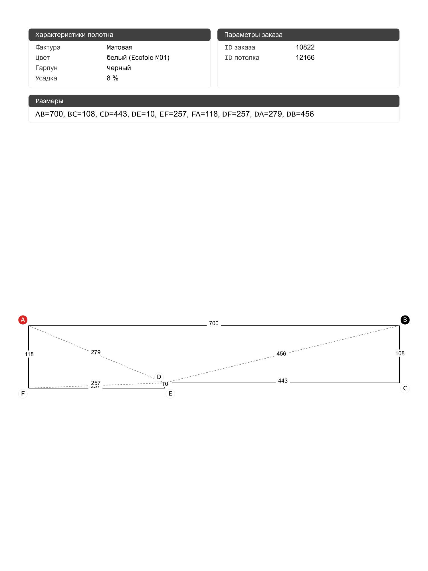 Натяжной потолок белый матовый с черным гарпуном, классической натяжки, изготовленный по индивидуальным размерам покупателя, для помещения площадью 7.8 м2