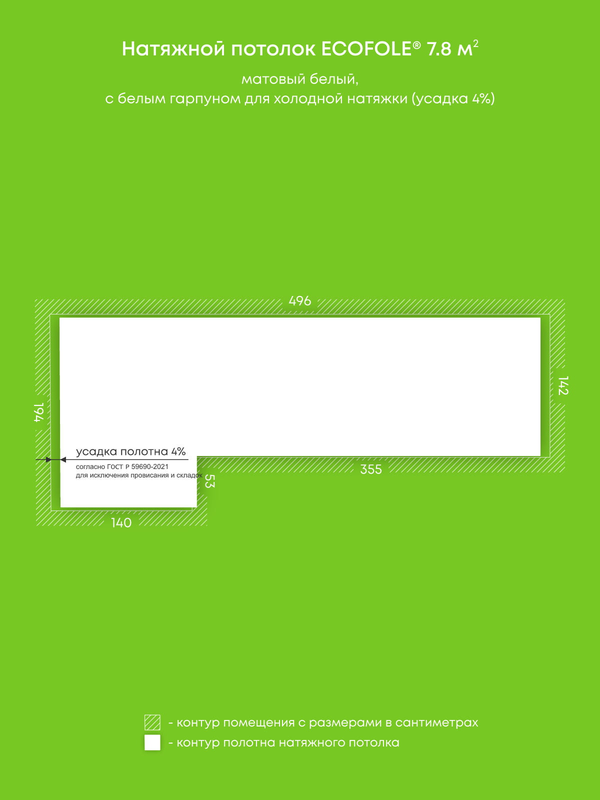 Натяжной потолок белый матовый, изготовленный по индивидуальным размерам покупателя, для помещения площадью 7.8 м2