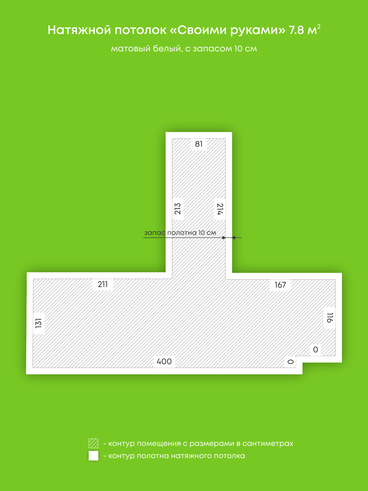 Натяжной потолок белый матовый, изготовленный по индивидуальным размерам покупателя, для помещения площадью 7.8 м2