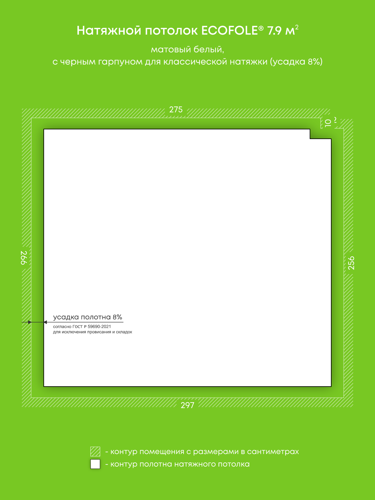 Натяжной потолок белый матовый, изготовленный по индивидуальным размерам покупателя, для кухни площадью 7.9 м2