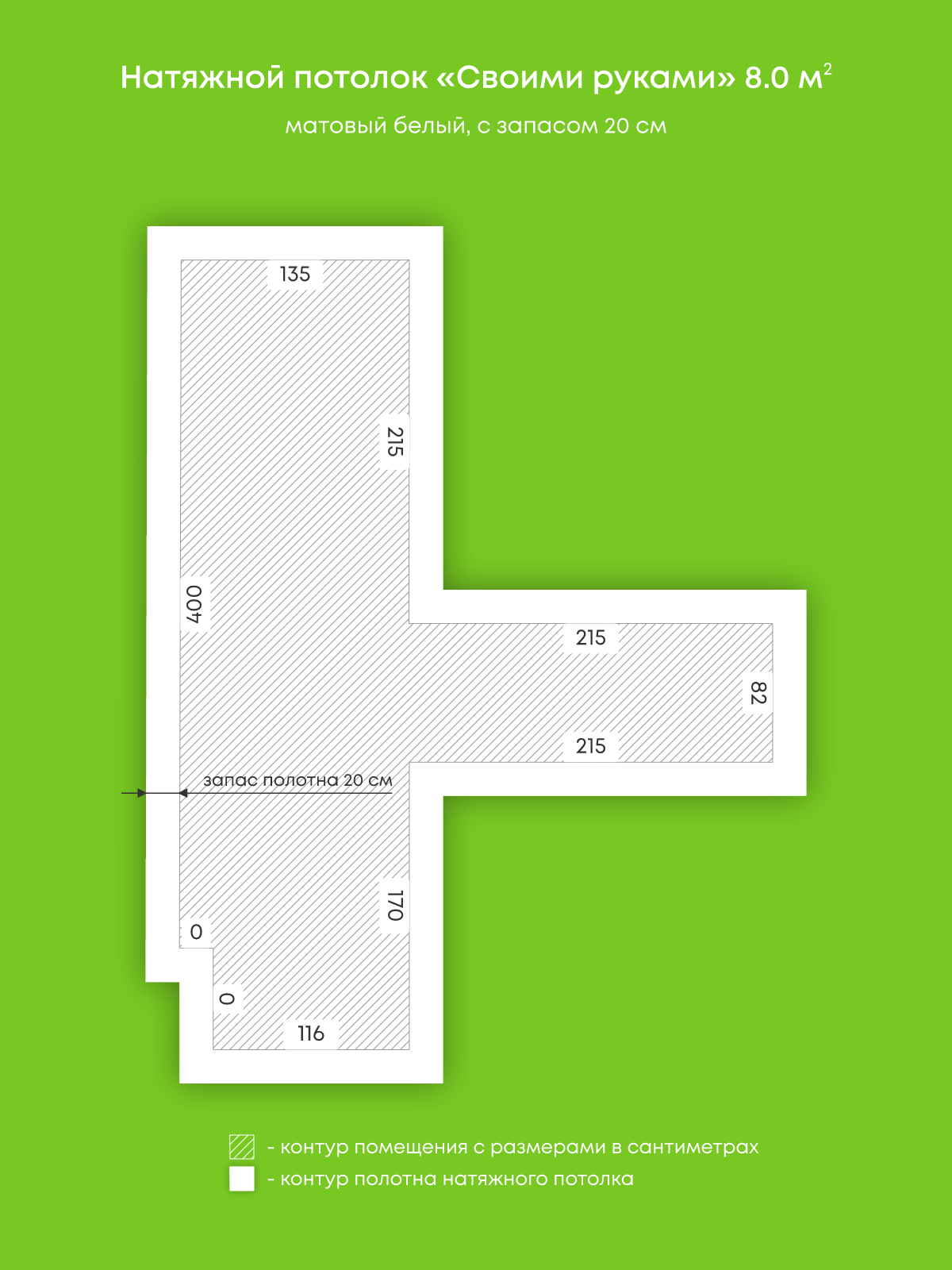 Натяжной потолок белый матовый, изготовленный по индивидуальным размерам покупателя, для гостиной площадью 8 м2
