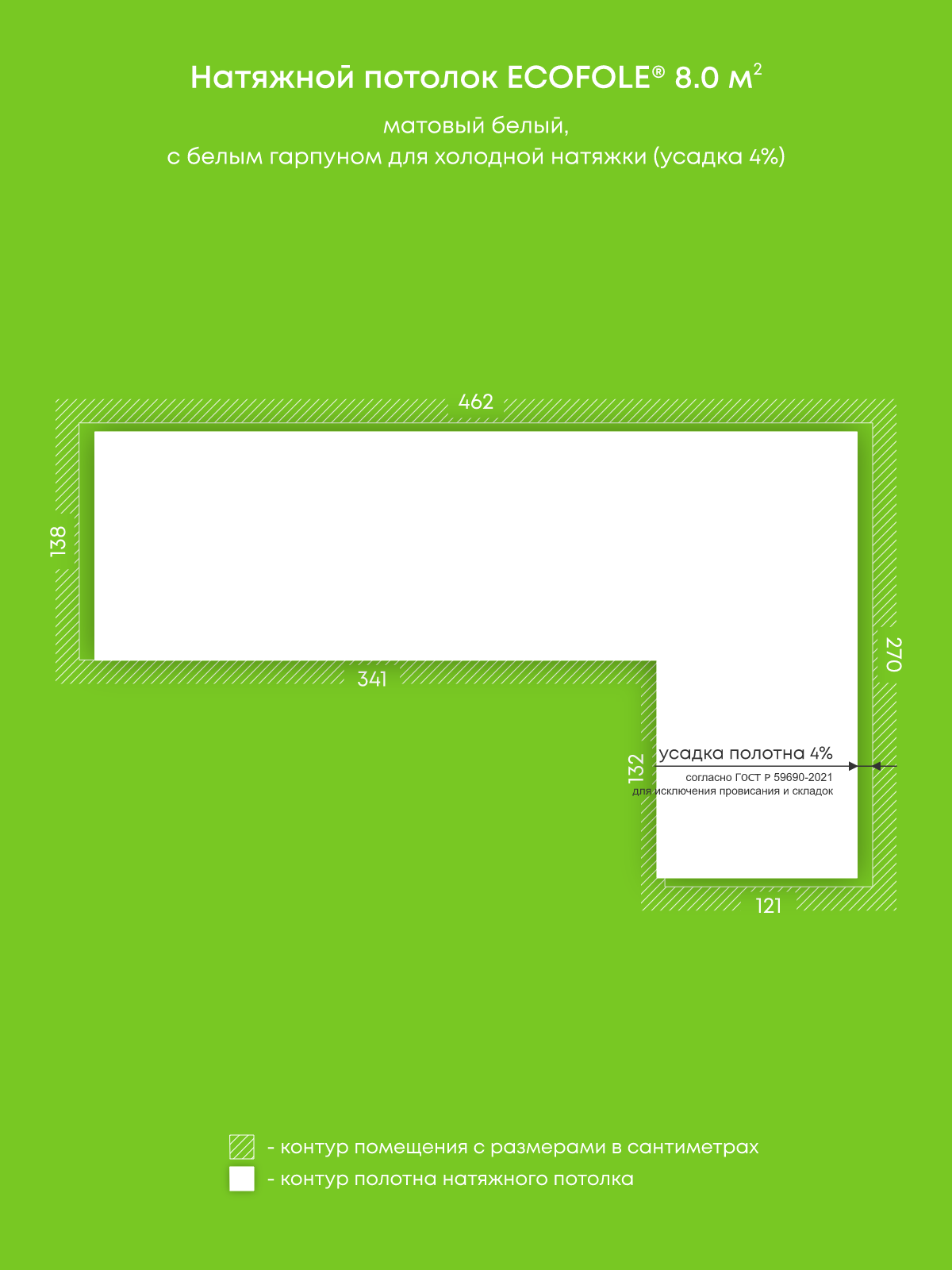 Натяжной потолок белый матовый, изготовленный по индивидуальным размерам покупателя, для помещения площадью 8 м2