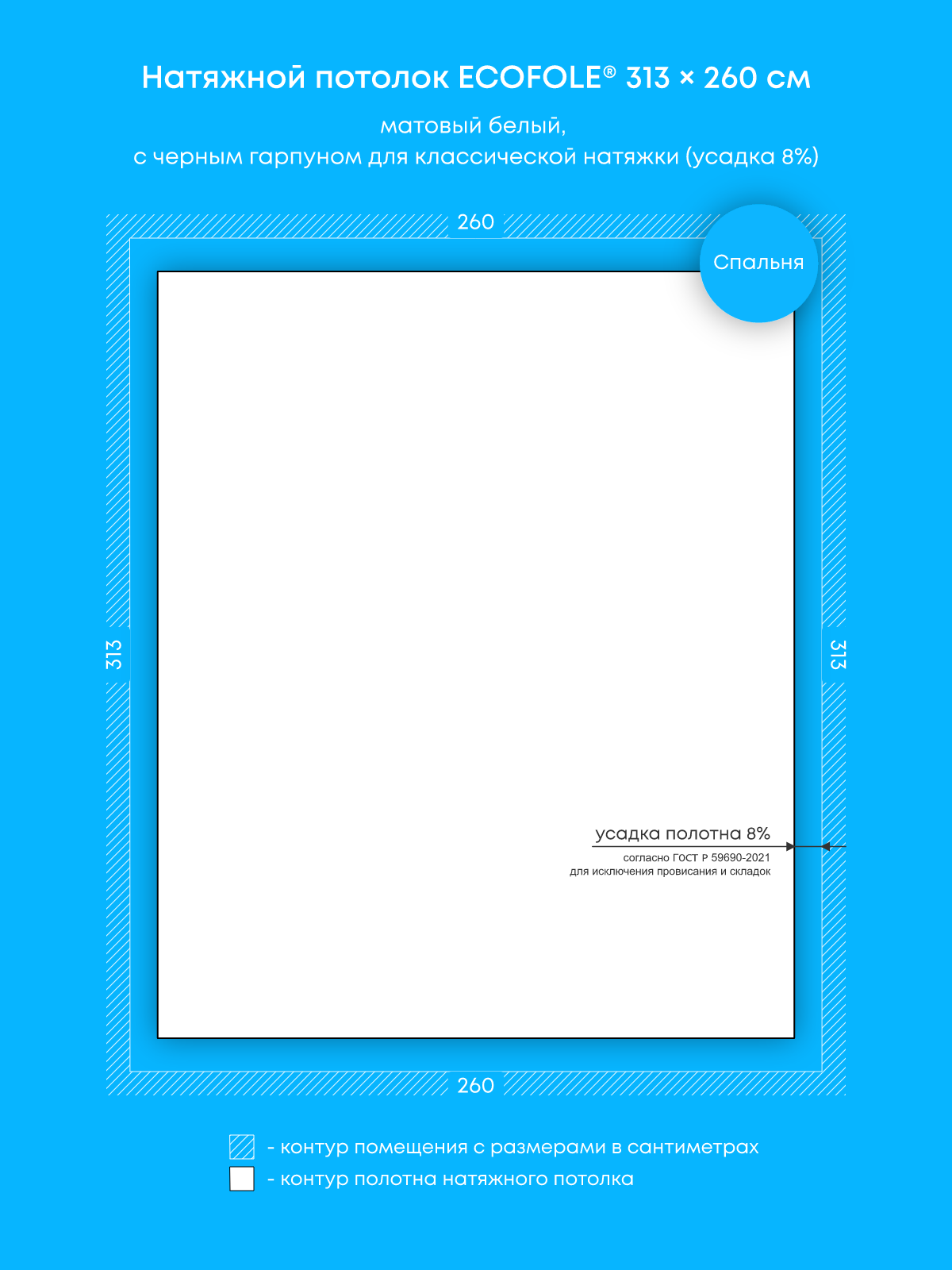 Натяжной потолок белый матовый с черным гарпуном, классической натяжки, изготовленный по индивидуальным размерам покупателя, для помещения площадью 8.1 м2