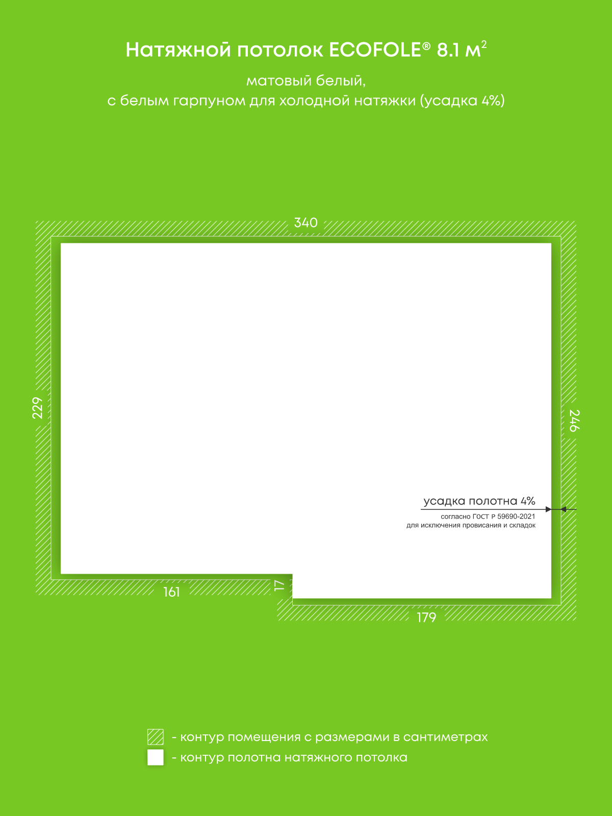 Натяжной потолок белый матовый, изготовленный по индивидуальным размерам покупателя, для спальни площадью 8.1 м2