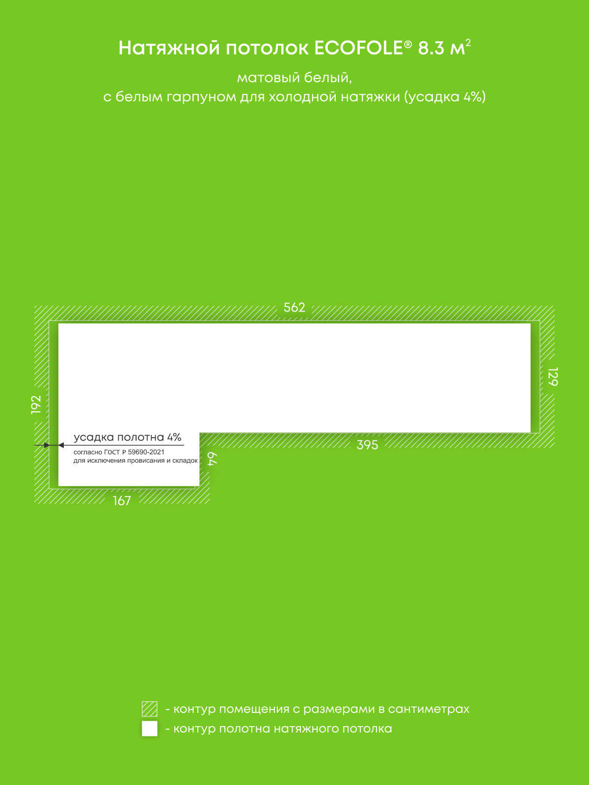 Натяжной потолок белый матовый, изготовленный по индивидуальным размерам покупателя, для помещения площадью 8.3 м2