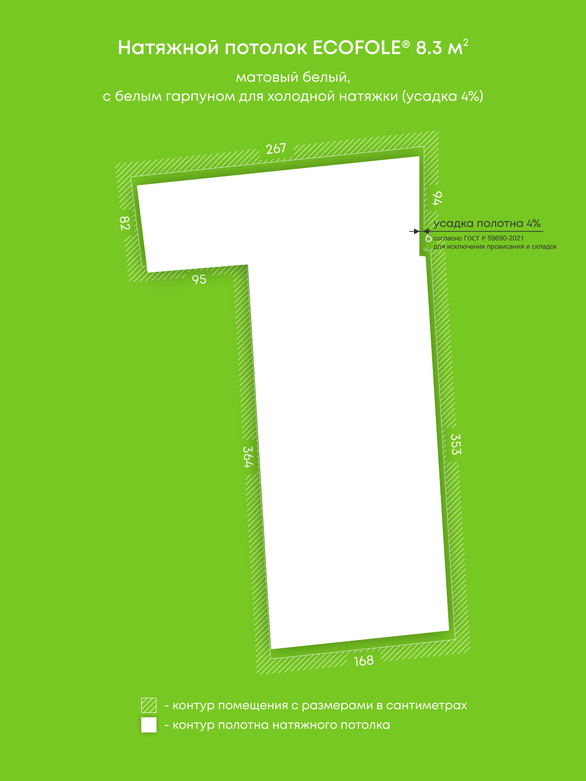 Натяжной потолок белый матовый, изготовленный по индивидуальным размерам покупателя, для помещения площадью 8.3 м2