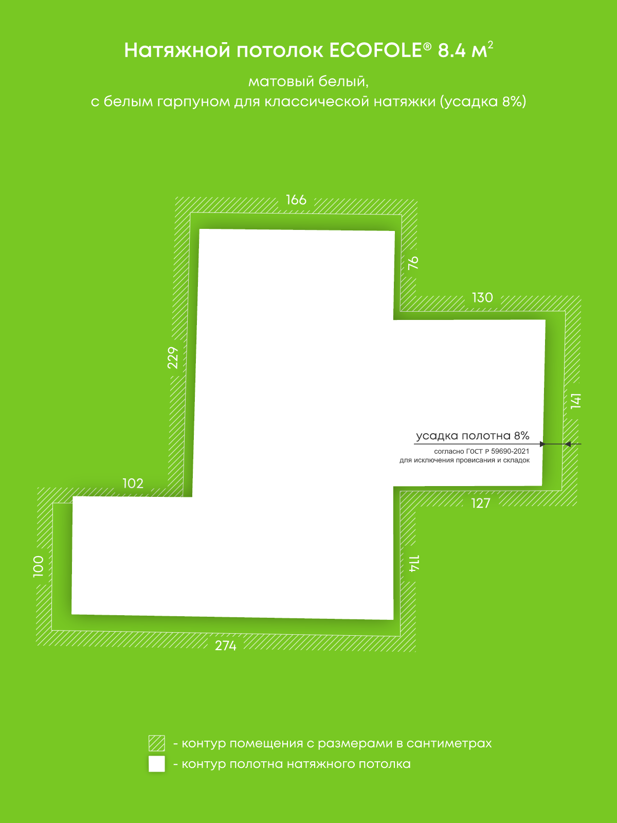 Натяжной потолок белый матовый, изготовленный по индивидуальным размерам покупателя, для помещения площадью 8.4 м2