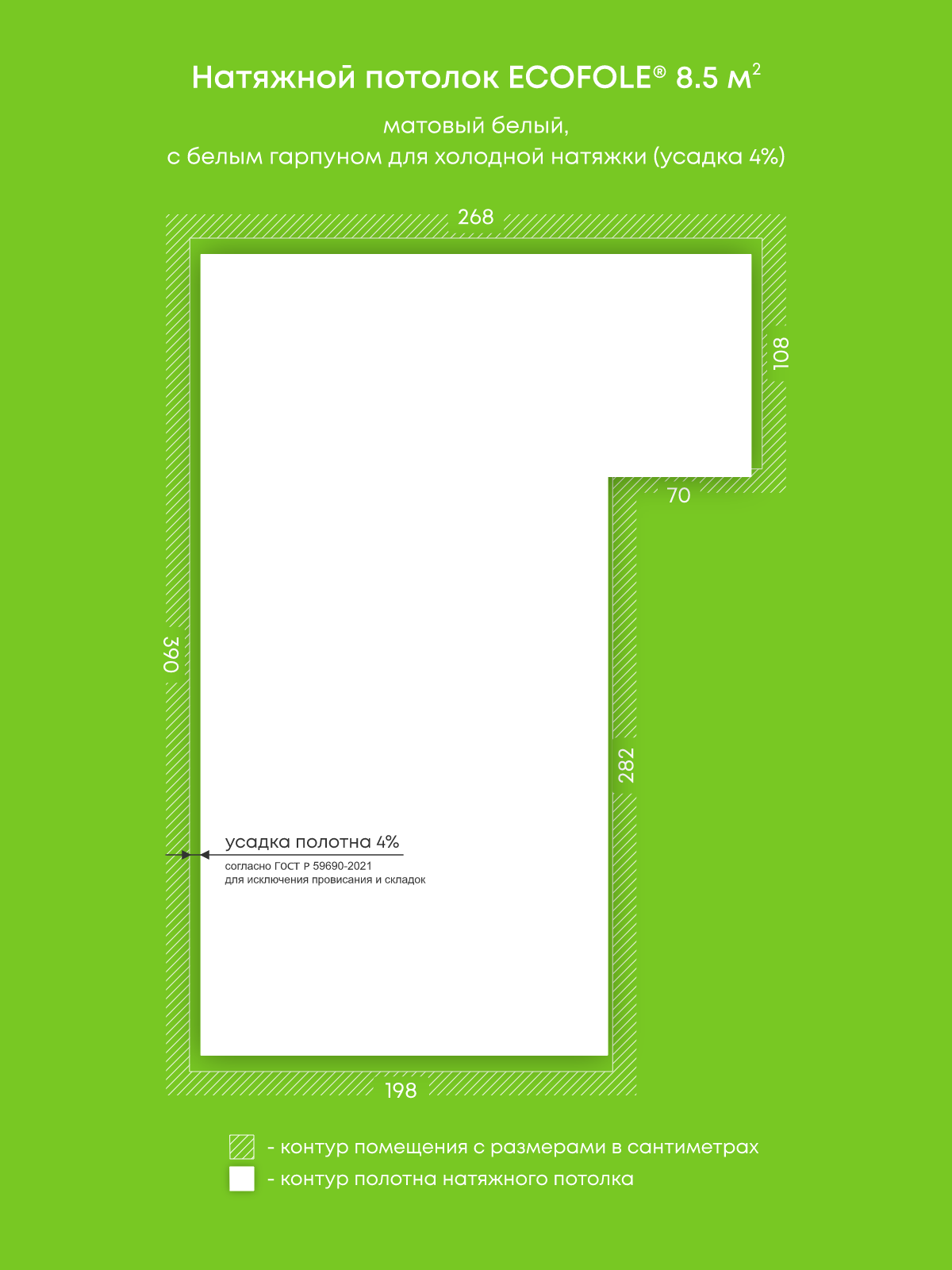 Натяжной потолок белый матовый, изготовленный по индивидуальным размерам покупателя, для гостиной площадью 8.5 м2