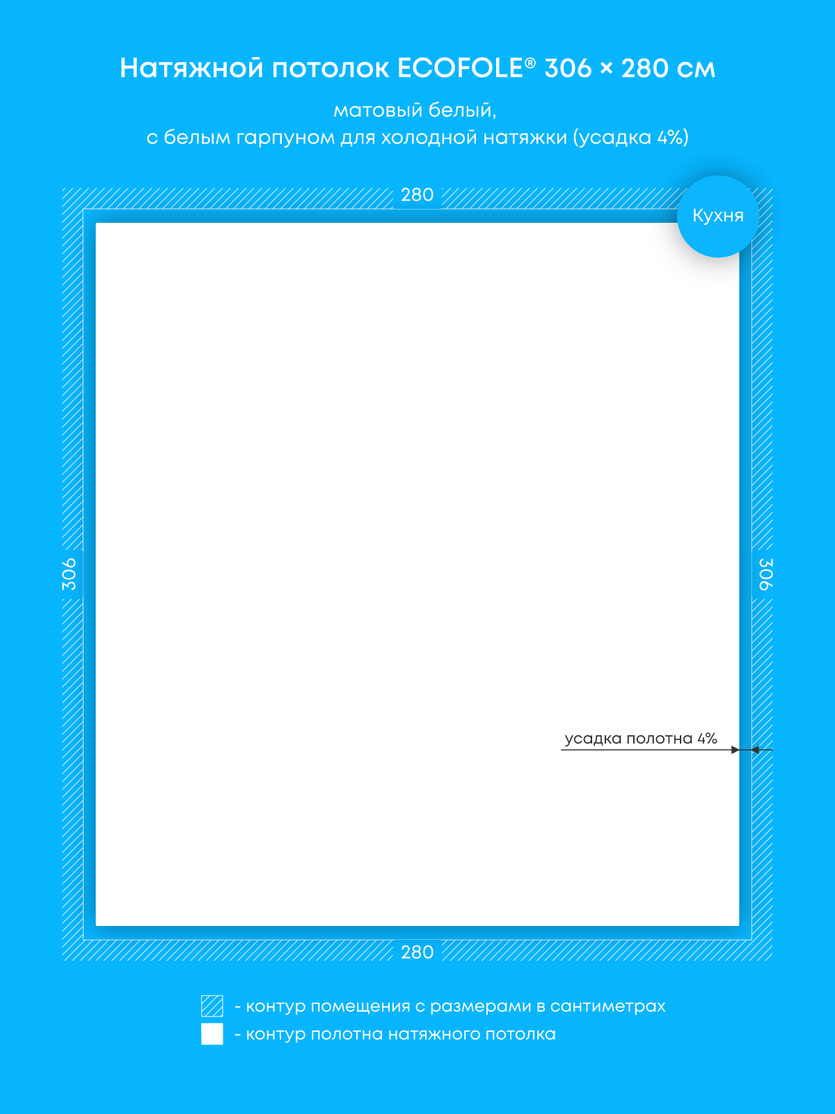 Натяжной потолок белый матовый, холодной натяжки, изготовленный по индивидуальным размерам покупателя, для помещения площадью 8.6 м2