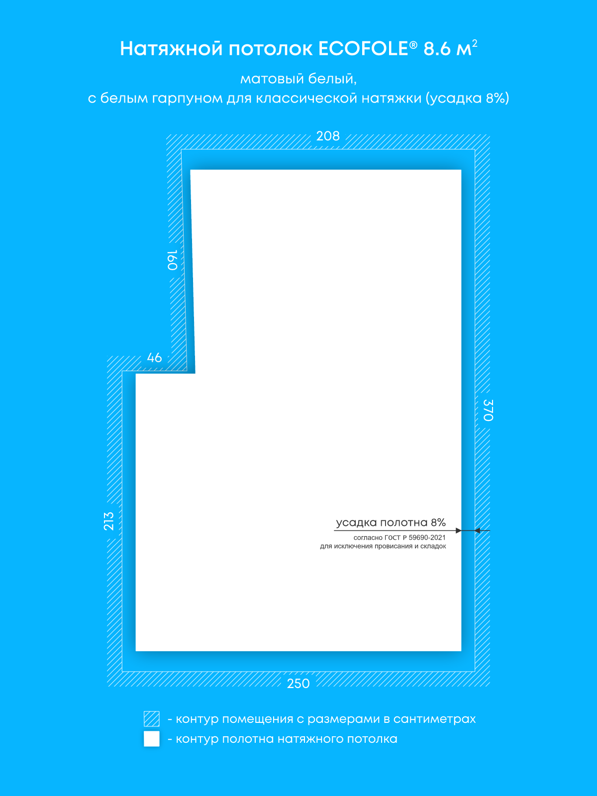 Натяжной потолок белый матовый, изготовленный по индивидуальным размерам покупателя, для помещения площадью 8.6 м2
