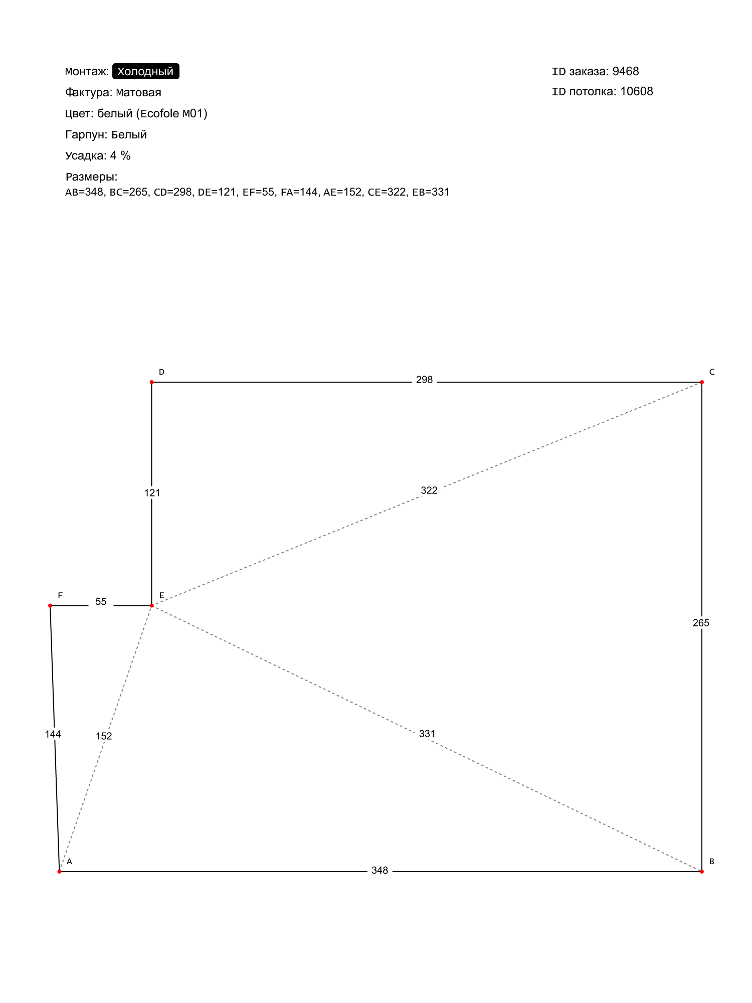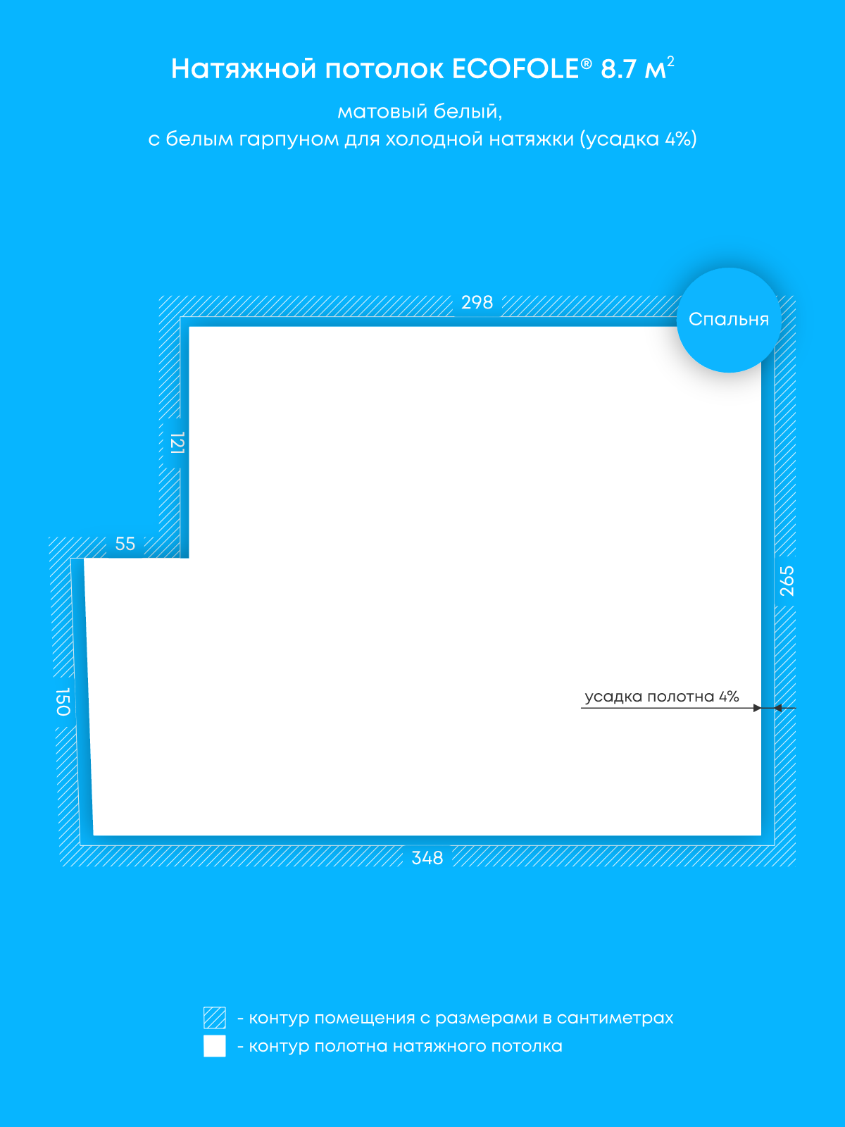 Натяжной потолок белый матовый, холодной натяжки, изготовленный по индивидуальным размерам покупателя, для помещения площадью 8.7 м2