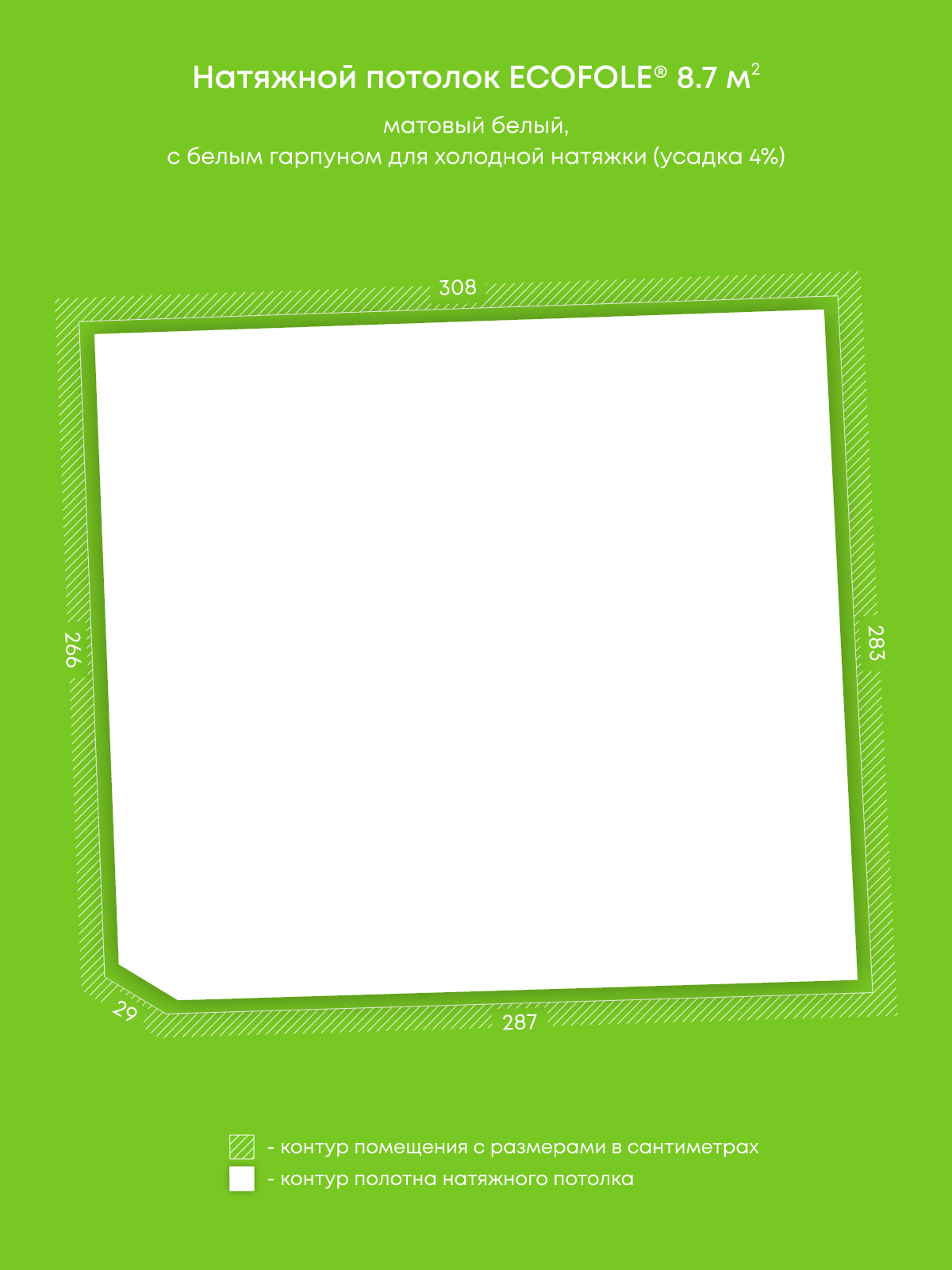 Натяжной потолок белый матовый, изготовленный по индивидуальным размерам покупателя, для кухни площадью 8.7 м2