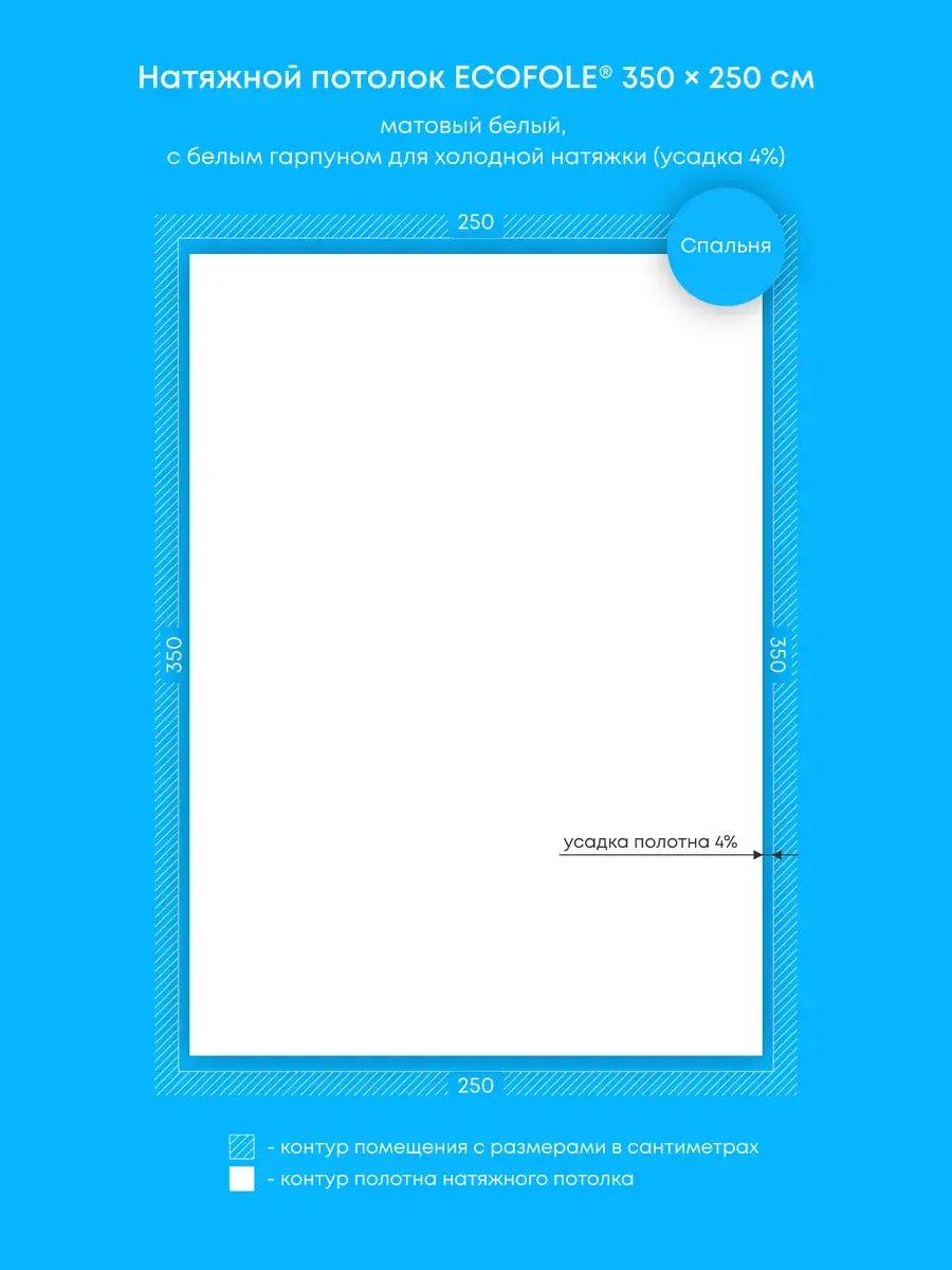 - Технология производства натяжного потолка предусматривает его усадку на 4-9% для исключения провисания после монтажа, т.е. фактический размер готового потолка составляет на 4-9% меньше исходного размера помещения и не является браком;