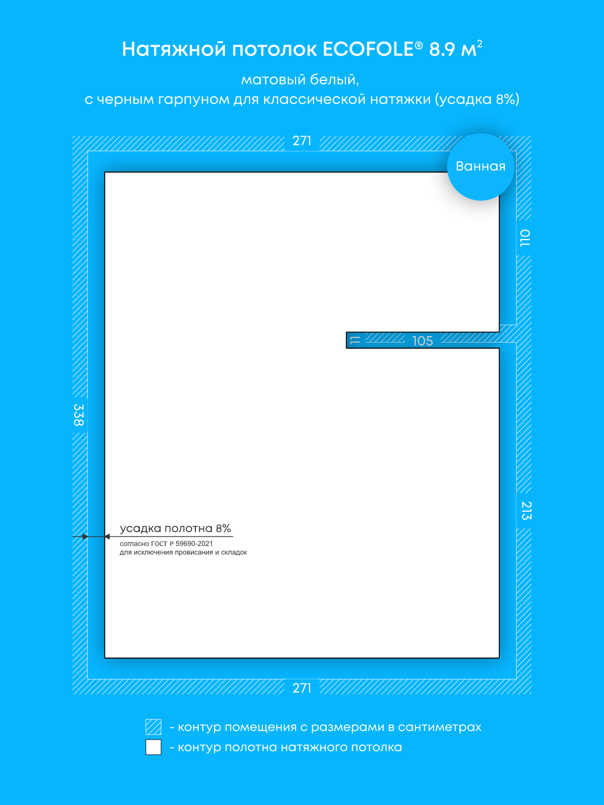 Натяжной потолок белый матовый, изготовленный по индивидуальным размерам покупателя, для ванной площадью 8.9 м2