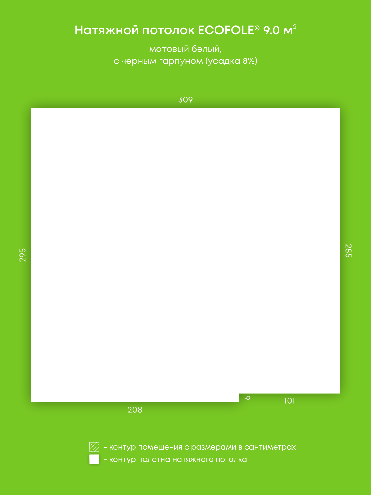 Натяжной потолок белый матовый, изготовленный по индивидуальным размерам покупателя, для помещения площадью 9 м2