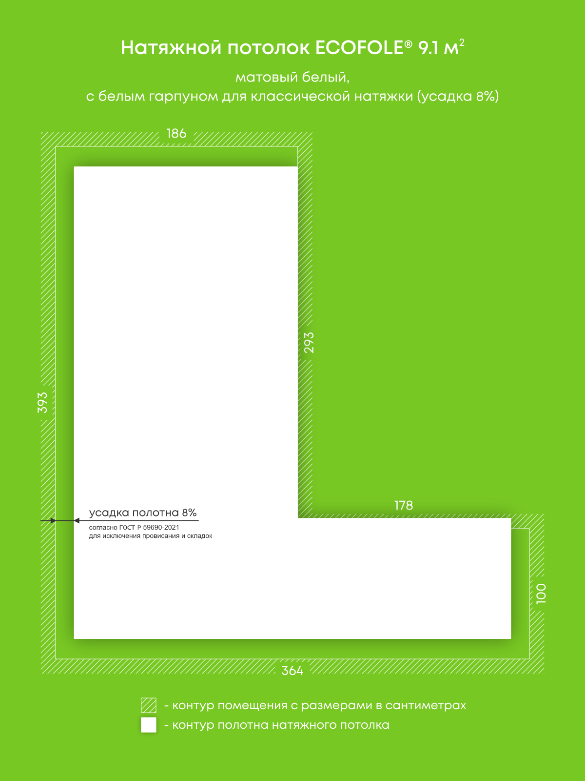 Натяжной потолок белый матовый, изготовленный по индивидуальным размерам покупателя, для комнаты площадью 9.1 м2