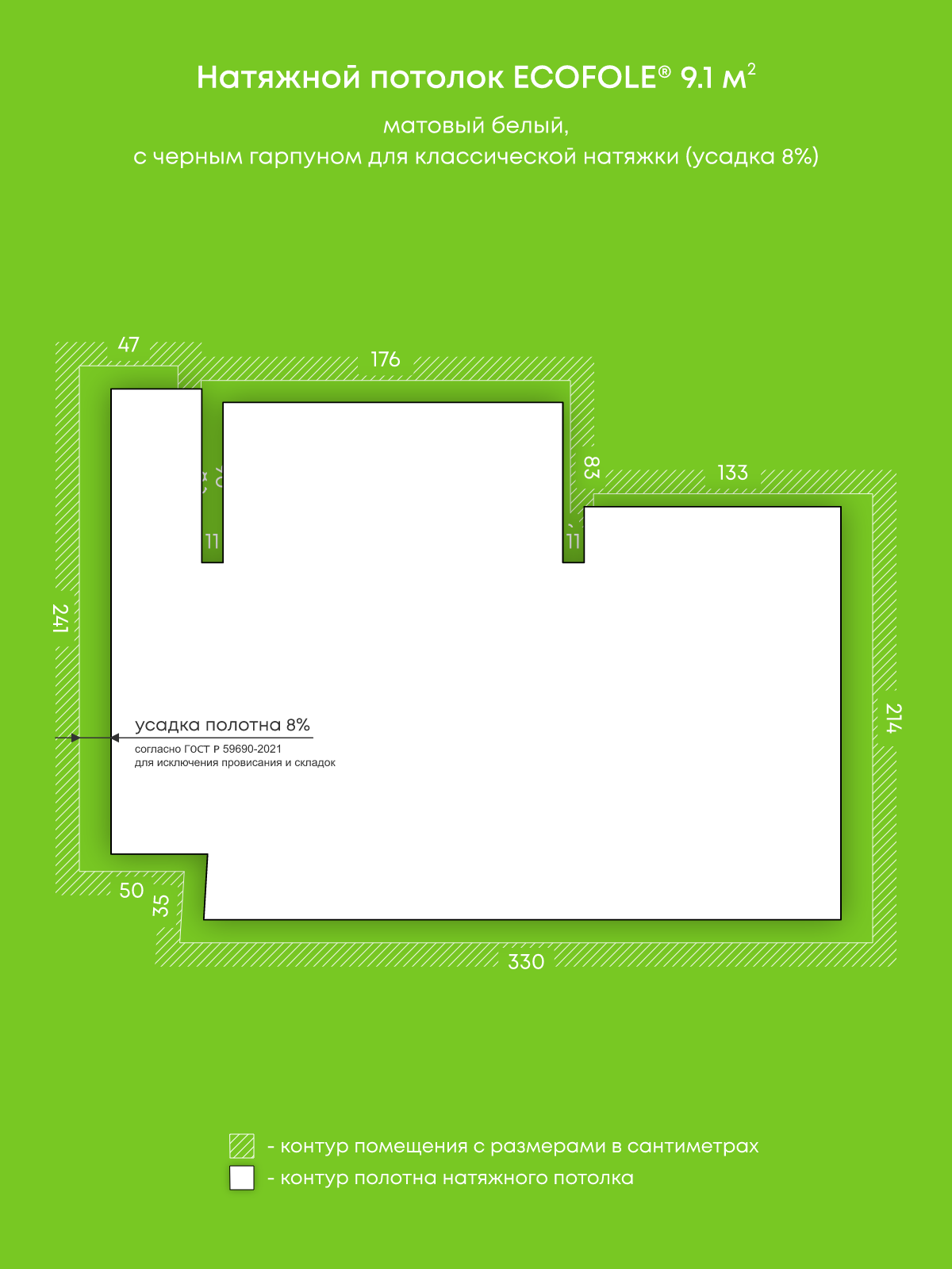 Натяжной потолок белый матовый, изготовленный по индивидуальным размерам покупателя, для комнаты площадью 9.1 м2