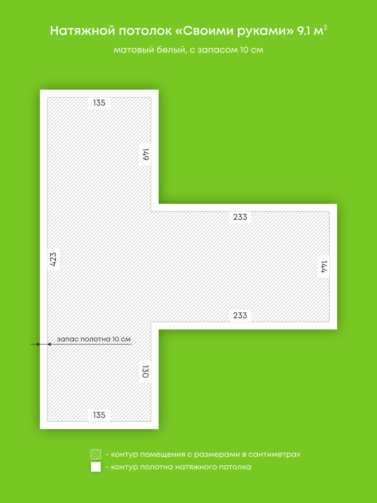 Натяжной потолок белый матовый, изготовленный по индивидуальным размерам покупателя, для помещения площадью 9.1 м2