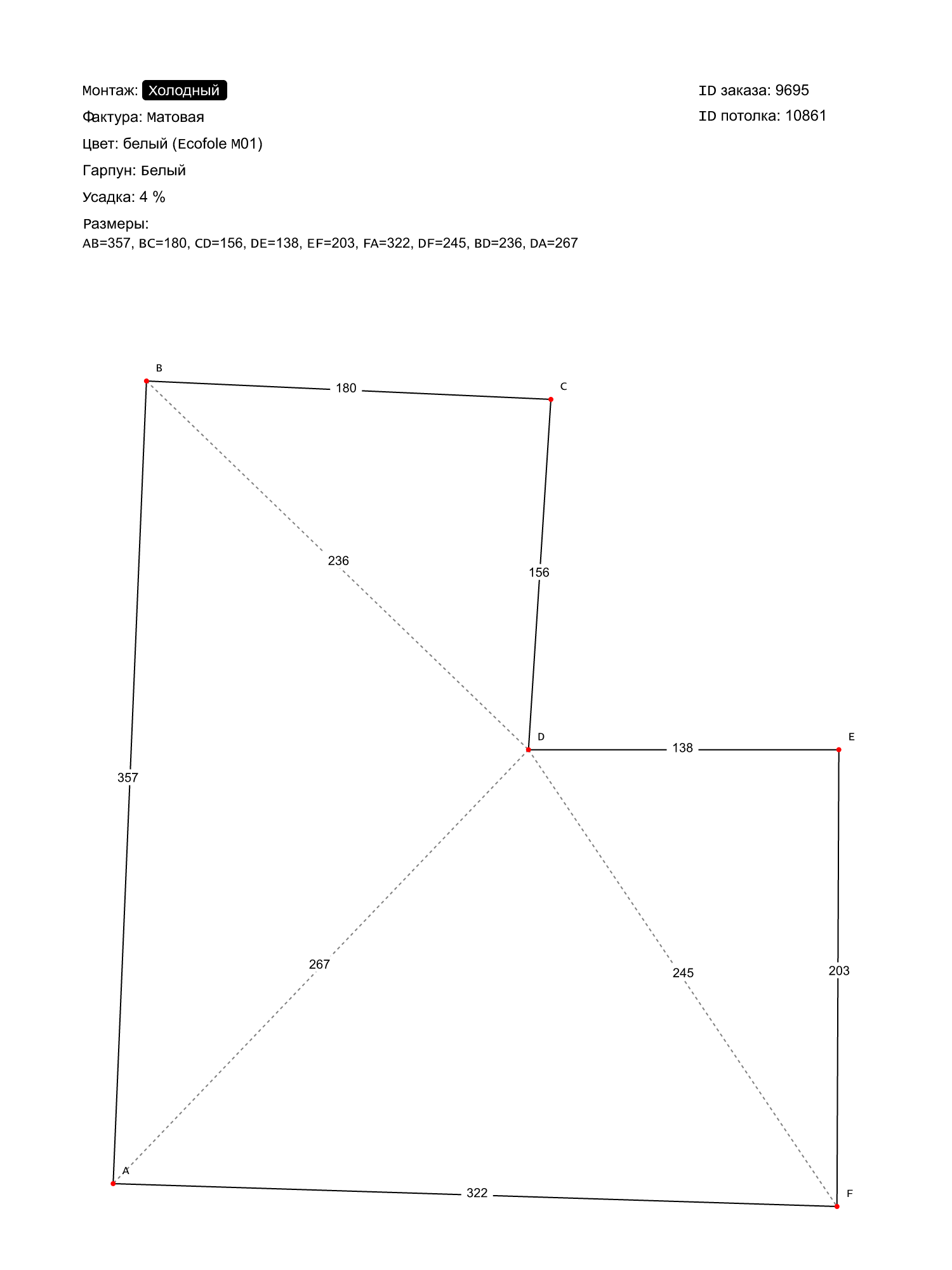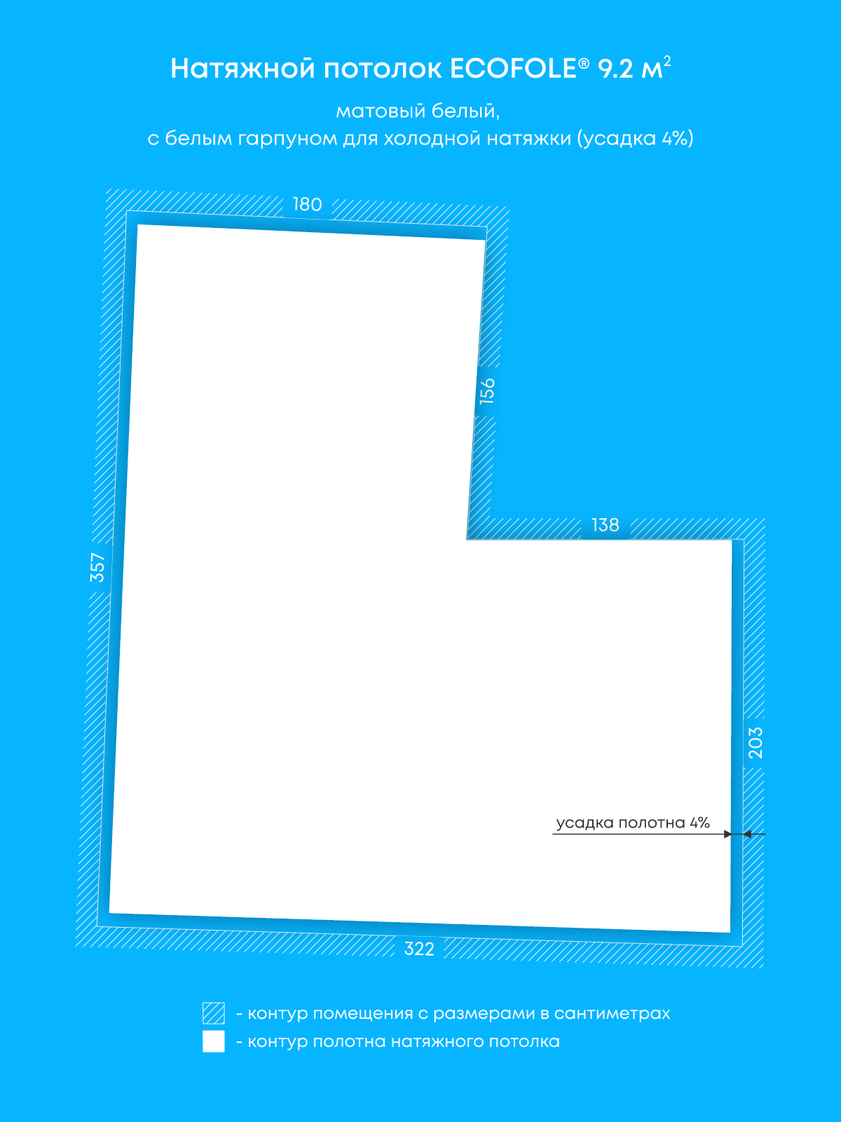 Натяжной потолок белый матовый, холодной натяжки, изготовленный по индивидуальным размерам покупателя, для помещения площадью 9.2 м2